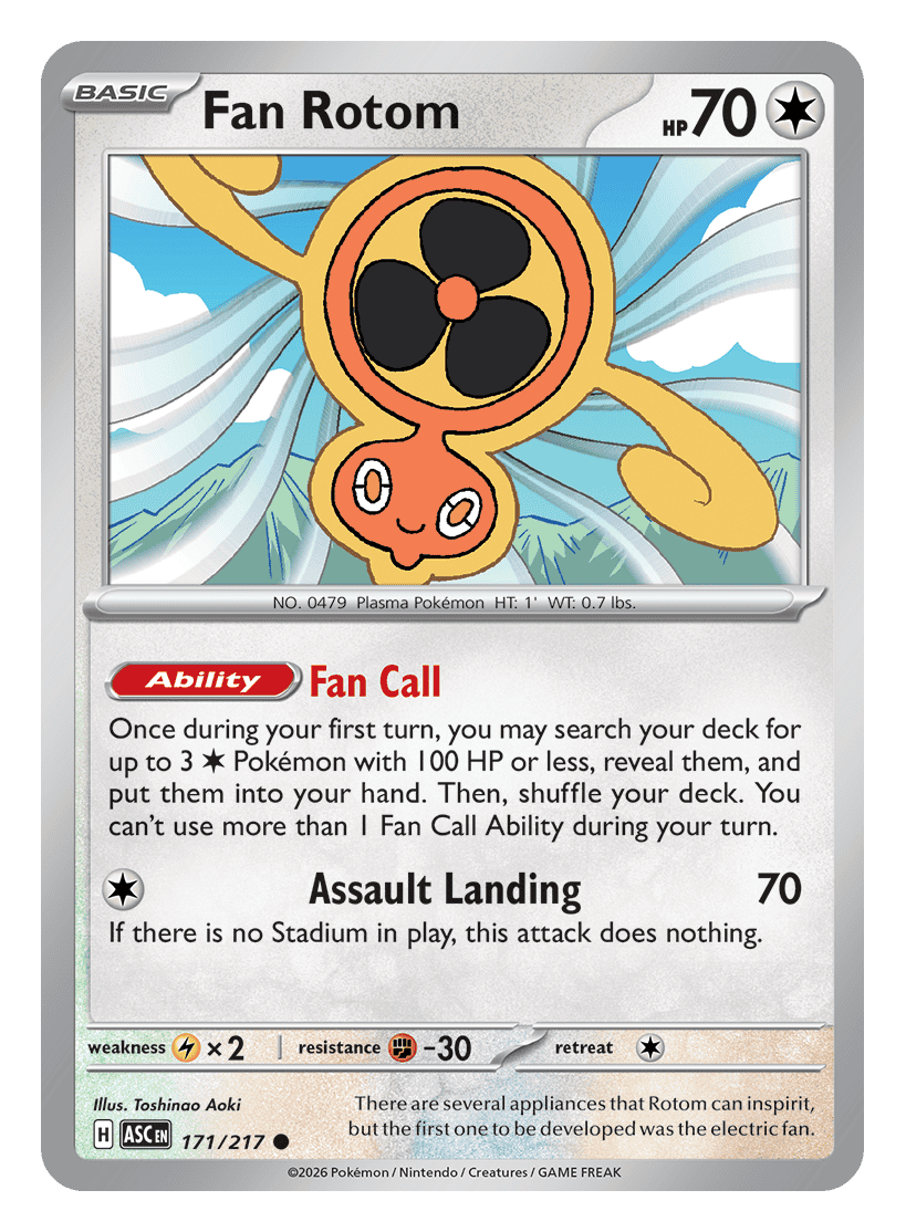 Once during your first turn, you may search your deck for up to 3 {C} Pokémon with 100 HP or less, reveal them, and put them into your hand. Then, shuffle your deck. You can’t use more than 1 Fan Call Ability during your turn.