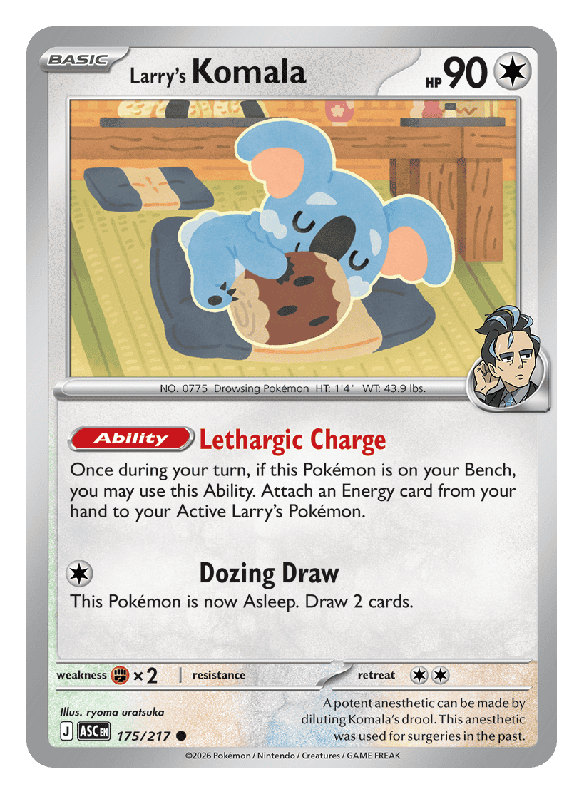 Once during your turn, if this Pokémon is on your Bench, you may use this Ability. Attach an Energy card from your hand to your Active Larry’s Pokémon.