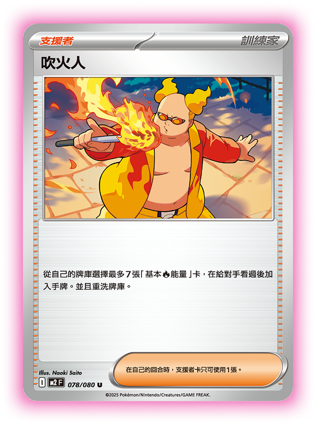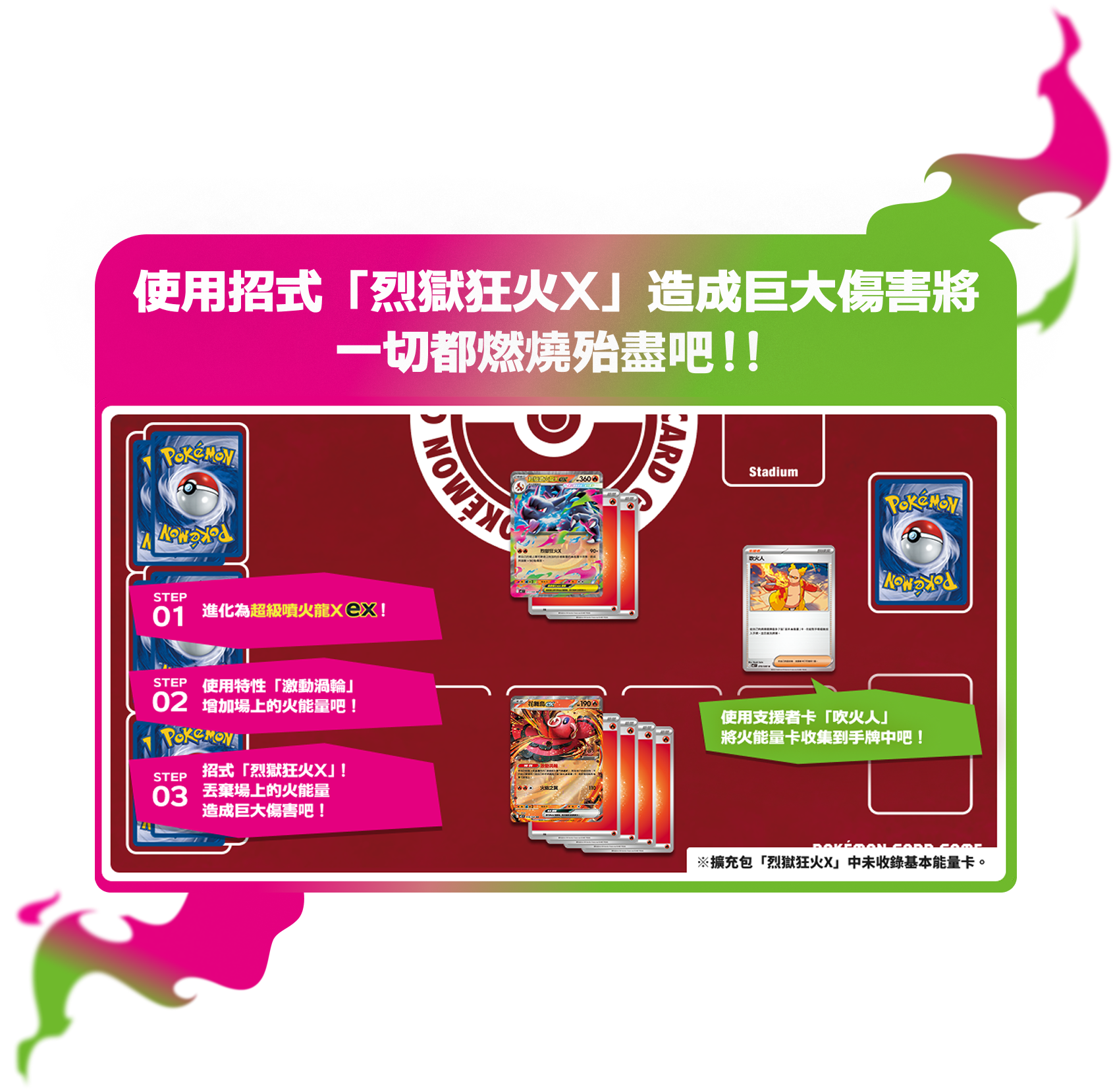 使用招式「烈獄狂火X」造成巨大傷害將一切都燃燒殆盡吧!! STEP01 進化為超級噴火龍Xex! STEP02 使用特性「激動渦輪 增加場上的火能量吧! STEP03 招式「烈獄狂火X」!丟棄場上的火能量造成巨大傷害吧! 使用支援者卡「吹火人」將火能量卡收集到手牌中吧!※擴充包「烈獄狂火X」中未收錄基本能量卡。