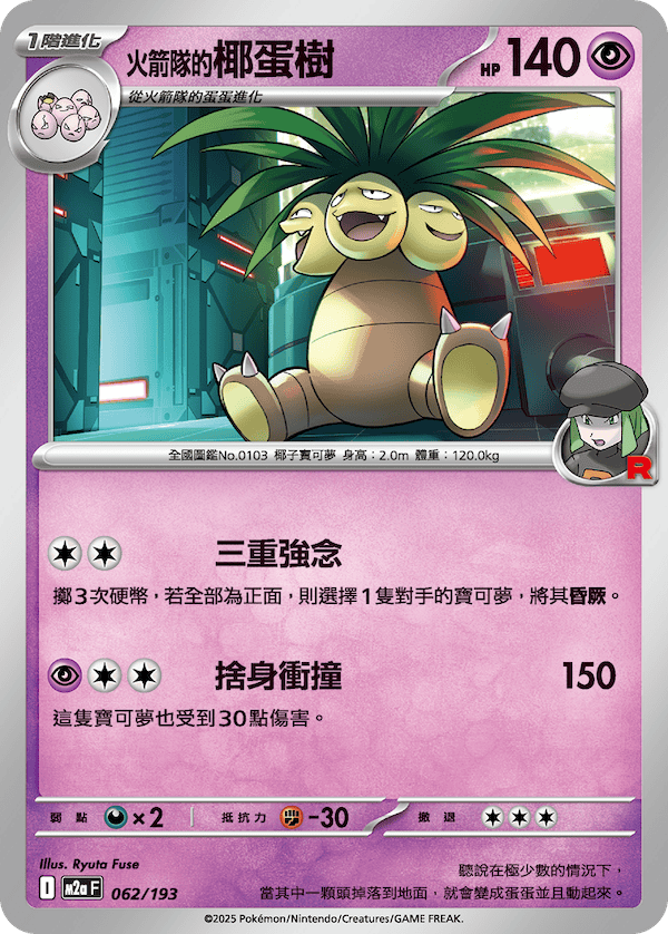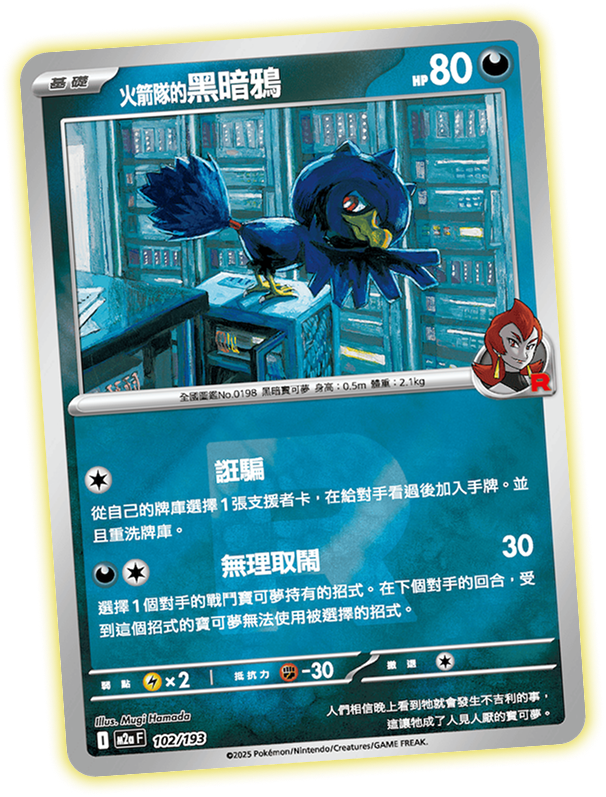 火箭隊的烏鴉頭頭的招式「火箭羽毛」。丟棄任意張數名稱包含「火箭隊」的支援者卡,並造成丟棄卡牌張數×60的傷害!