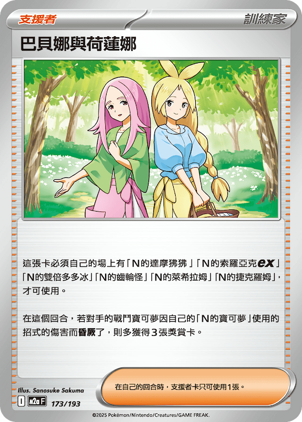 雖然巴貝娜與荷蓮娜的使用條件很嚴苛,但只要以「N的寶可夢」使用的招式傷害對手的對戰寶可夢並使其昏厥,即可額外抽取3張獎賞卡!