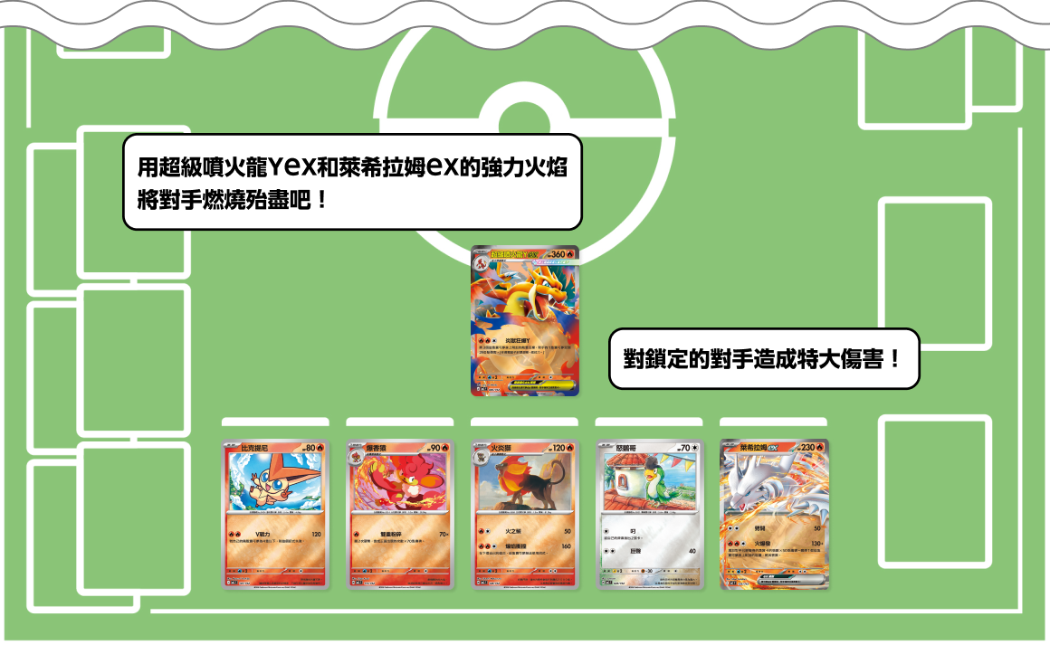超級噴火龍Yex的招式「炎獄狂爆Y」可以選擇對手的1隻寶可夢造成280點傷害,萊希拉姆ex的招式「火爆發」可依據對手獲得的獎賞卡張數提升傷害,視情況來進行戰鬥吧。
