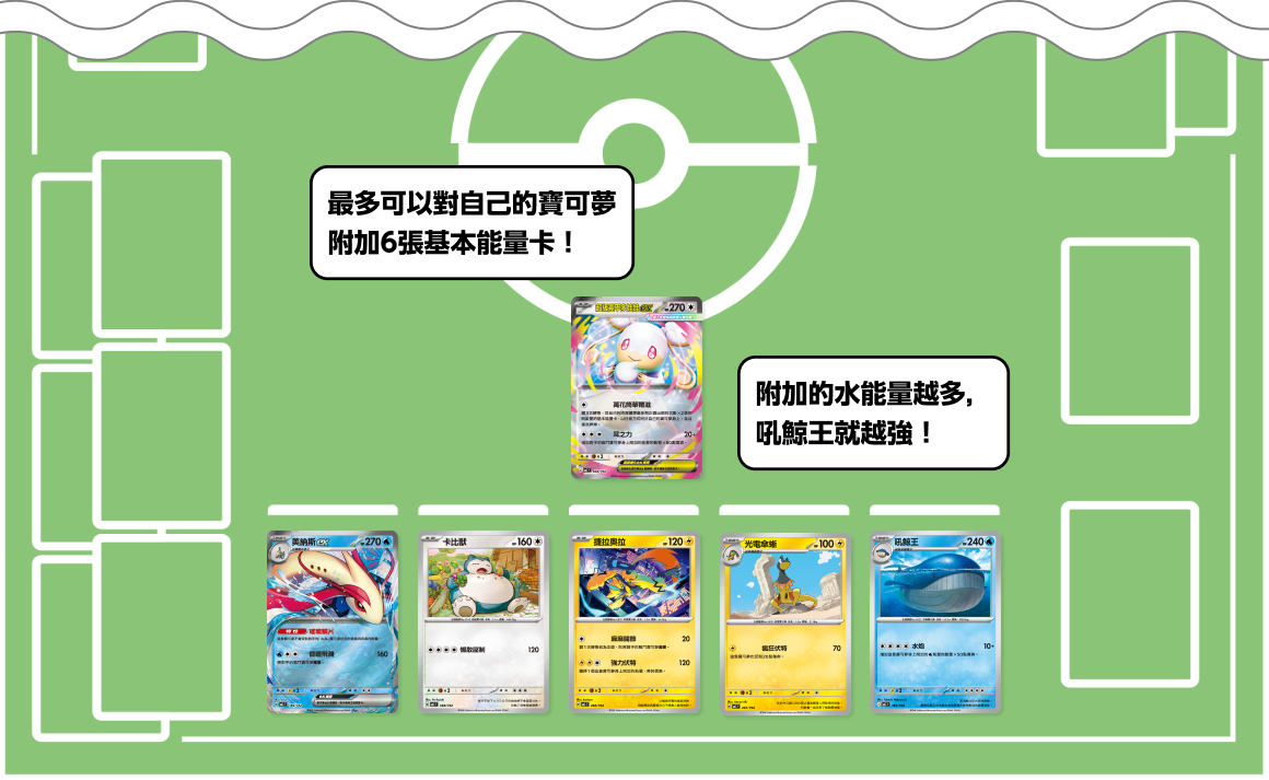 吼鯨王的招式「水炮」附加的水能量越多,造成的傷害就越大。雖然為1階進化寶可夢,但擁有極高的最大HP也是其優勢。靈活運用其他寶可夢卡及訓練家卡,贏取附加大量能量卡的時間吧。