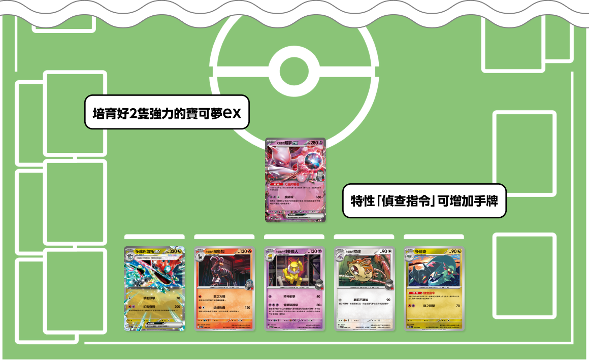 - 由於是需要做好準備才能攻擊的寶可夢ex,在遊戲開局有可能會被對手獲得獎賞卡,但不要著急,繼續準備,找機會大逆轉吧!