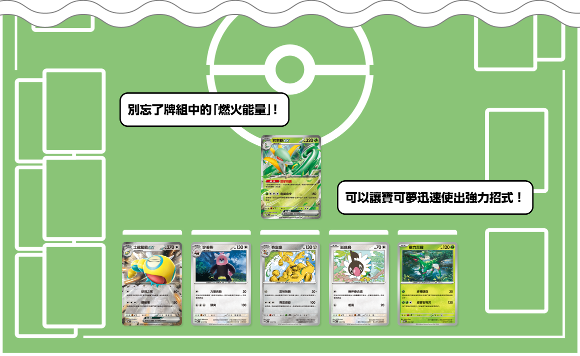 - 使用君主蛇ex的招式「青草命令」擁有的效果,只要將燃火能量加入到手牌中,就能更容易在下個回合連續使出招式。