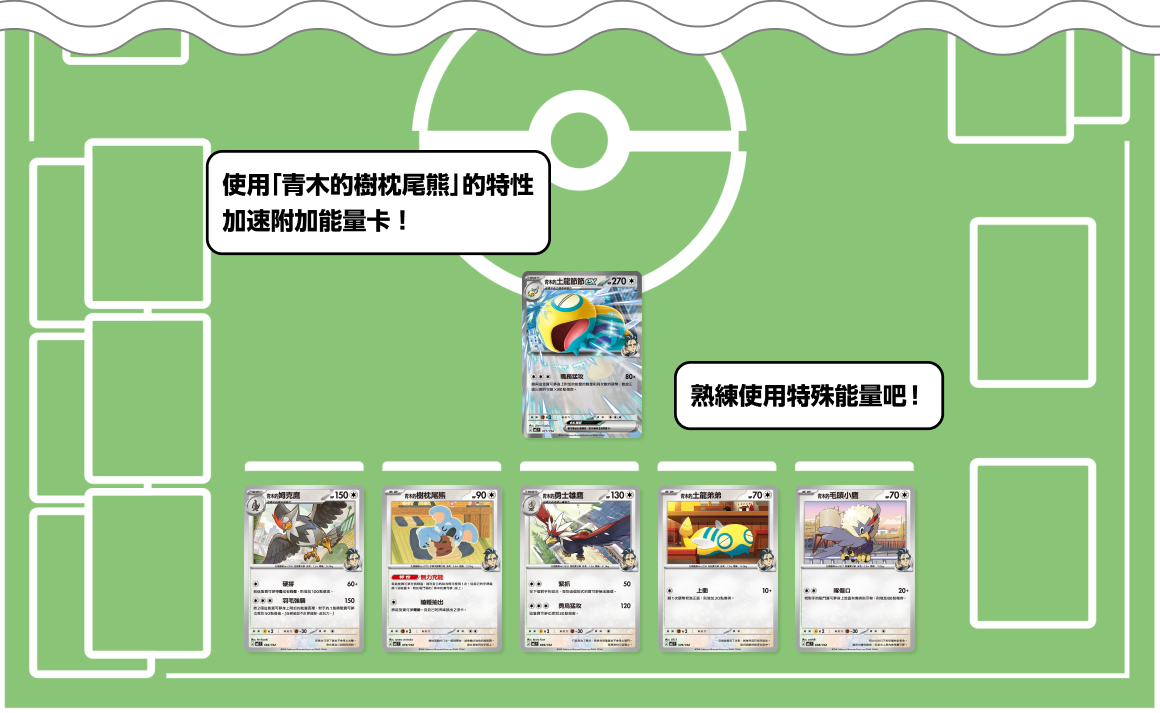 使用特性「無力充能」,可以從自己的手牌選擇1張能量卡,附於戰鬥場的「青木的寶可夢」身上。可以迅速為強力的招式做好準備。