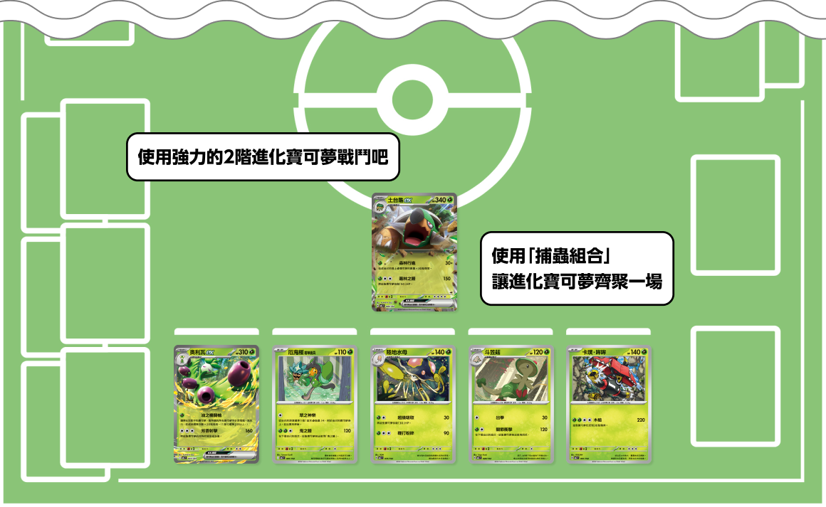 - 開局以陸地水母和斗笠菇等1階進化寶可夢為中心戰鬥吧。