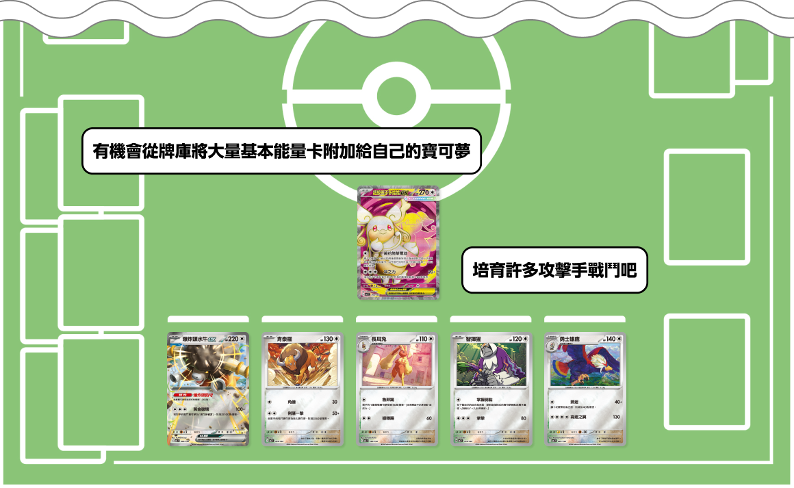 - 這副牌組的強處是,只要使用超級差不多娃娃ex的招式「萬花筒華爾滋」,把能量卡附加給自己的寶可夢,就能視情況選擇戰鬥的寶可夢。