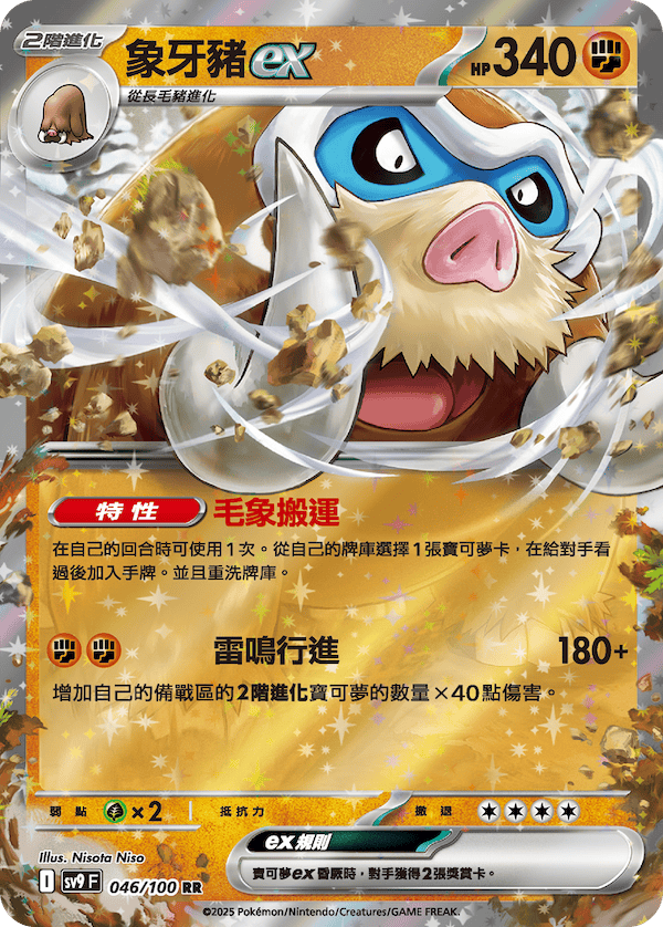 使用特性「毛象搬運」將2階進化寶可夢放置於被戰區後,再使用招式「雷鳴行進」對對手造成巨大傷害,是從開局到終局都能大顯身手的寶可夢ex!