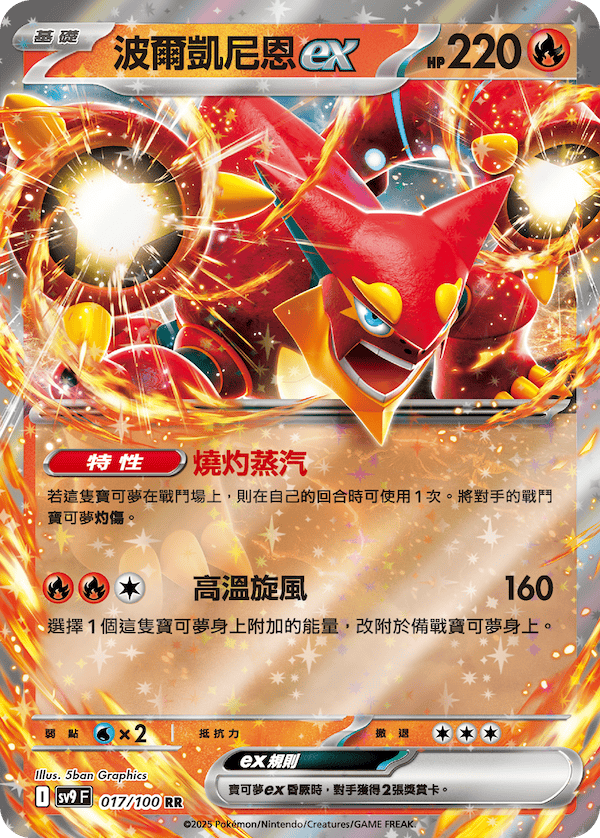 特性「燒灼蒸汽」在自己的回合時可使用1次,可以將對手的戰鬥寶可夢灼傷!