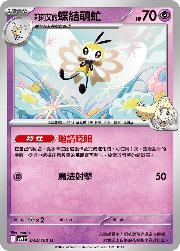 特性「邀請眨眼」為在從手牌使出這張卡並完成進化時,可以從對手的手牌中選擇任意數量的基礎寶可夢卡,放置於對手的備戰區!