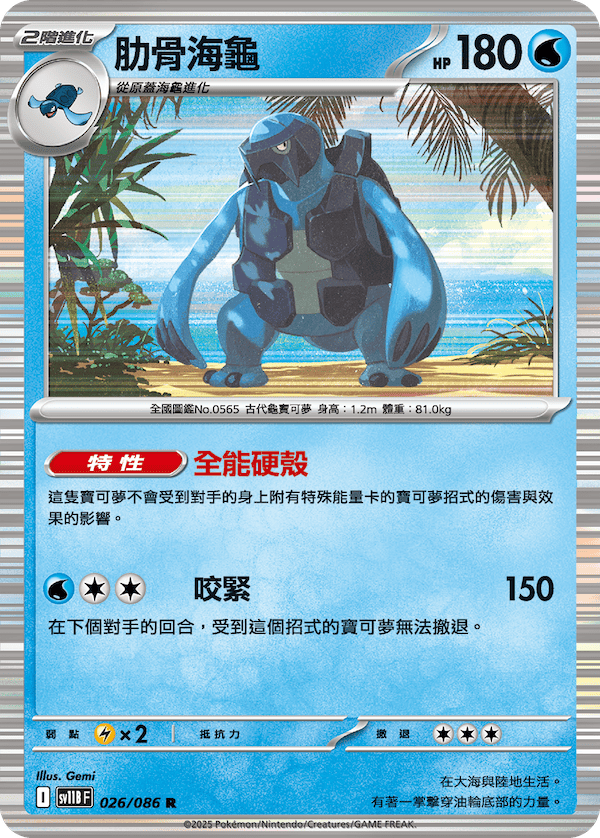 可以進化為原蓋海龜,作為無屬性基礎寶可夢放置於場上的物品卡。