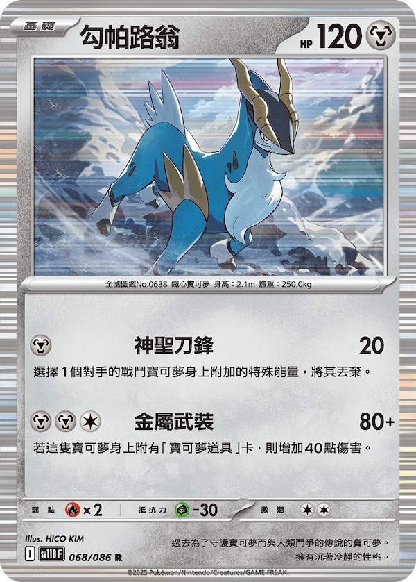 招式「神聖刀鋒」可以在造成20點傷害的同時,選擇1個對手的戰鬥寶可夢身上附加的特殊能量,將其丟棄。