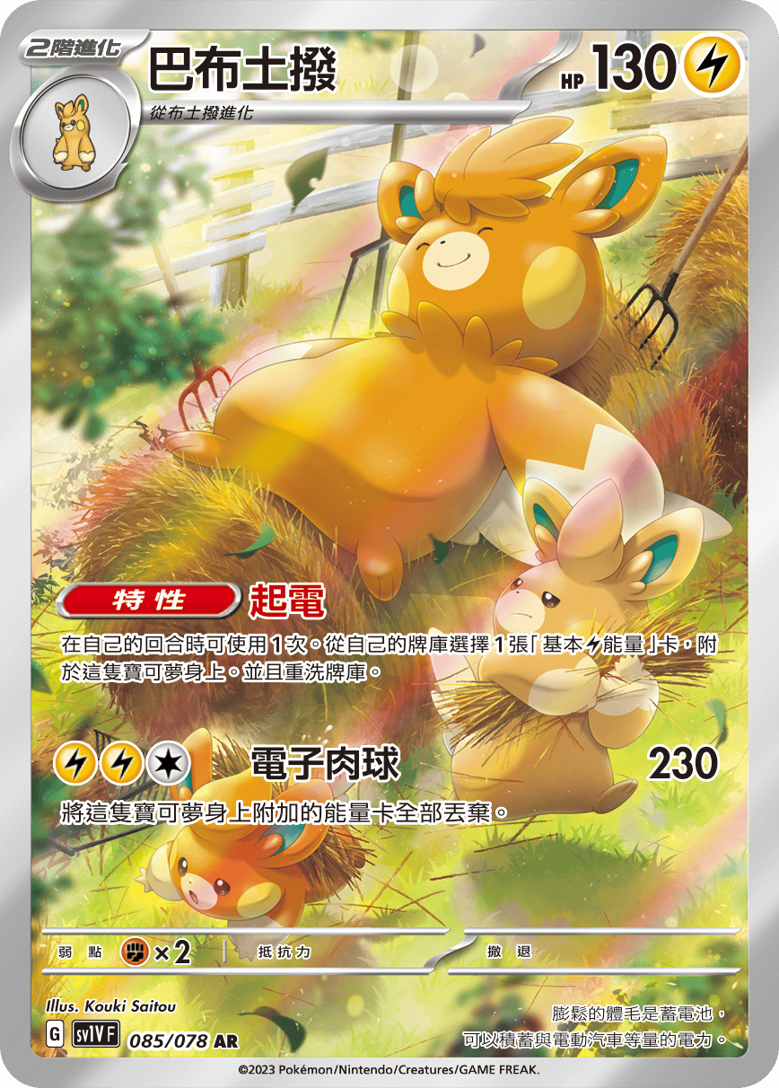 在自己的回合時可使用1次。從自己的牌庫選擇1張「基本【雷】能量」卡,附於這隻寶可夢身上。並且重洗牌庫。