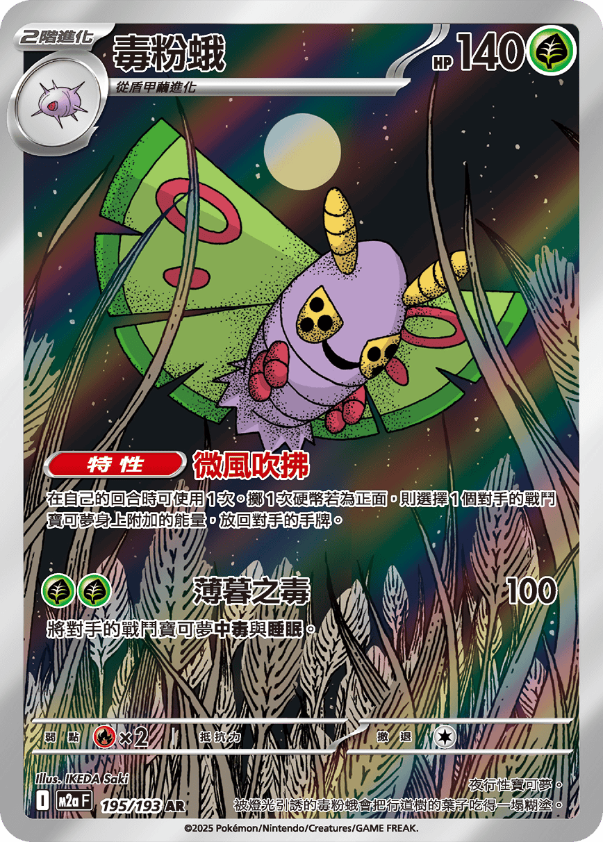 夜行性寶可夢。 被燈光引誘的毒粉蛾會把 行道樹的葉子吃得一塌糊塗。
