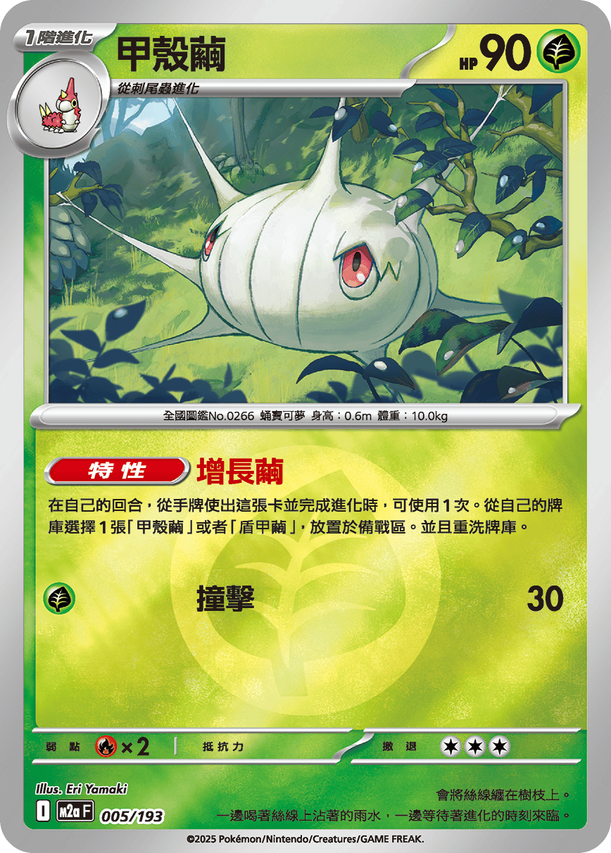 在自己的回合,從手牌使出這張卡並完成進化時,可使用1次。從自己的牌庫選擇1張「甲殼繭」或者「盾甲繭」,放置於備戰區。並且重洗牌庫。