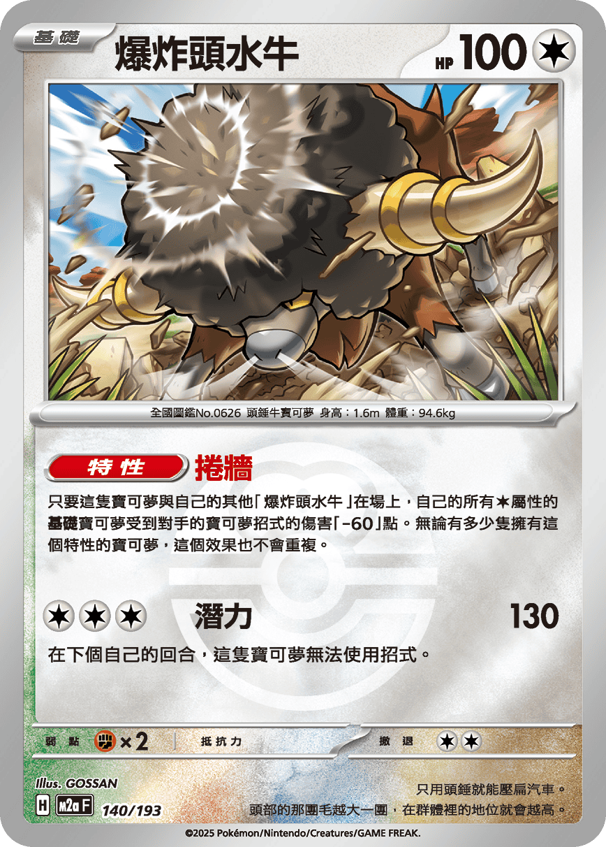 只要這隻寶可夢與自己的其他「爆炸頭水牛」在場上,自己的所有【無】屬性的【基礎】寶可夢受到對手的寶可夢招式的傷害「-60」點。無論有多少隻擁有這個特性的寶可夢,這個效果也不會重複。