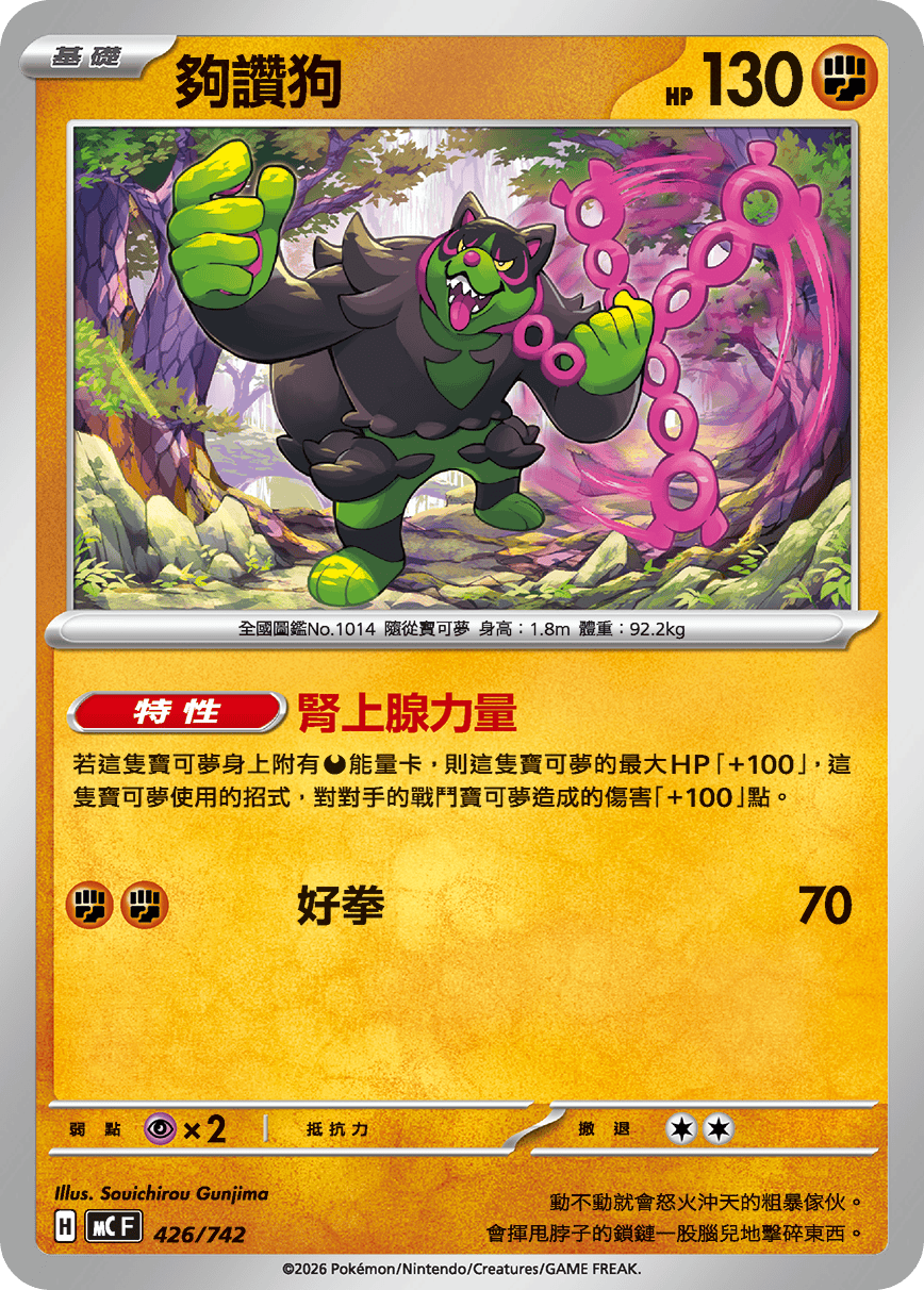 若這隻寶可夢身上附有【惡】能量卡,則這隻寶可夢的最大HP「+100」,這隻寶可夢使用的招式,對對手的戰鬥寶可夢造成的傷害「+100」點。