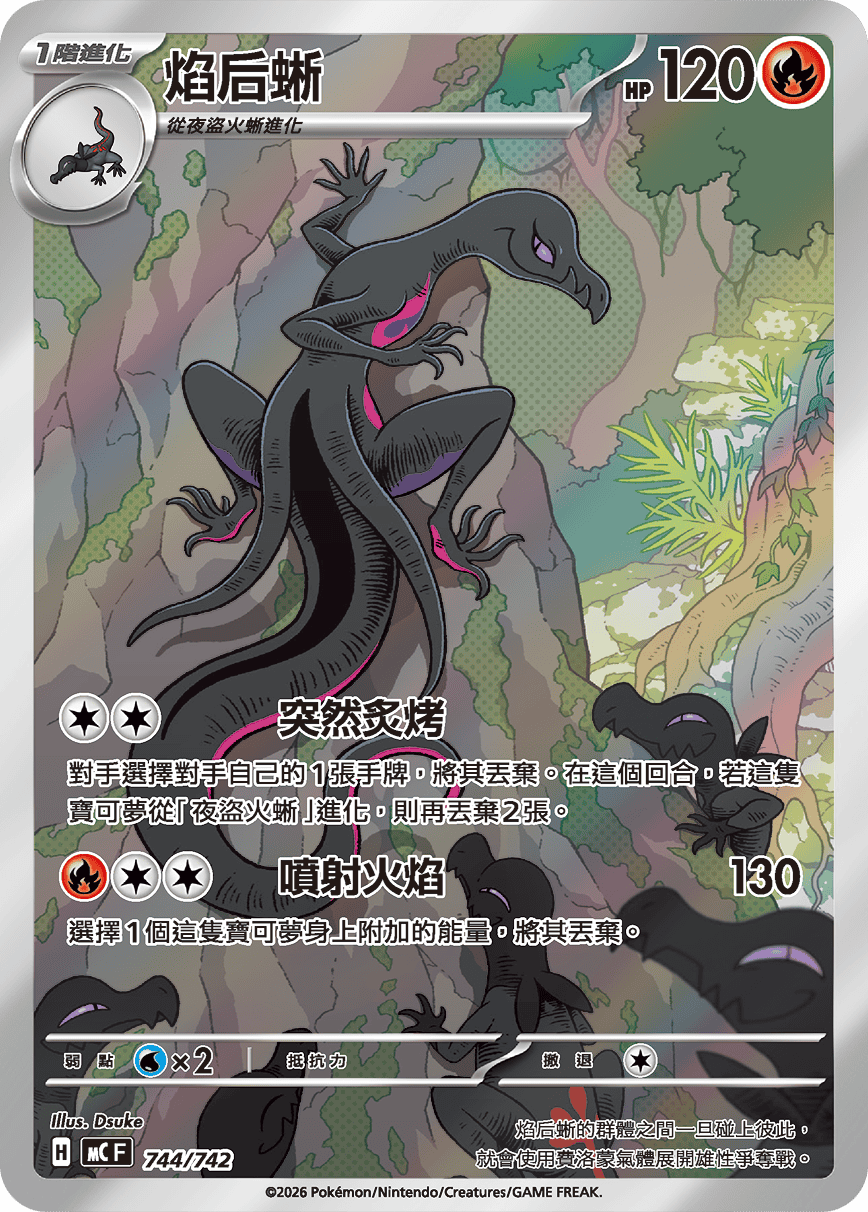對手選擇對手自己的1張手牌,將其丟棄。在這個回合,若這隻寶可夢從「夜盜火蜥」進化,則再丟棄2張。
