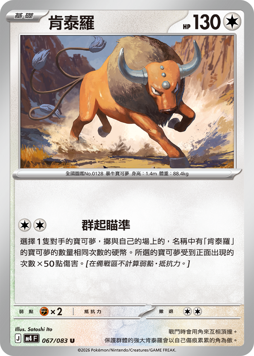 選擇1隻對手的寶可夢,擲與自己的場上的,名稱中有「肯泰羅」的寶可夢的數量相同次數的硬幣。所選的寶可夢受到正面出現的次數×50點傷害。[在備戰區不計算弱點・抵抗力。]