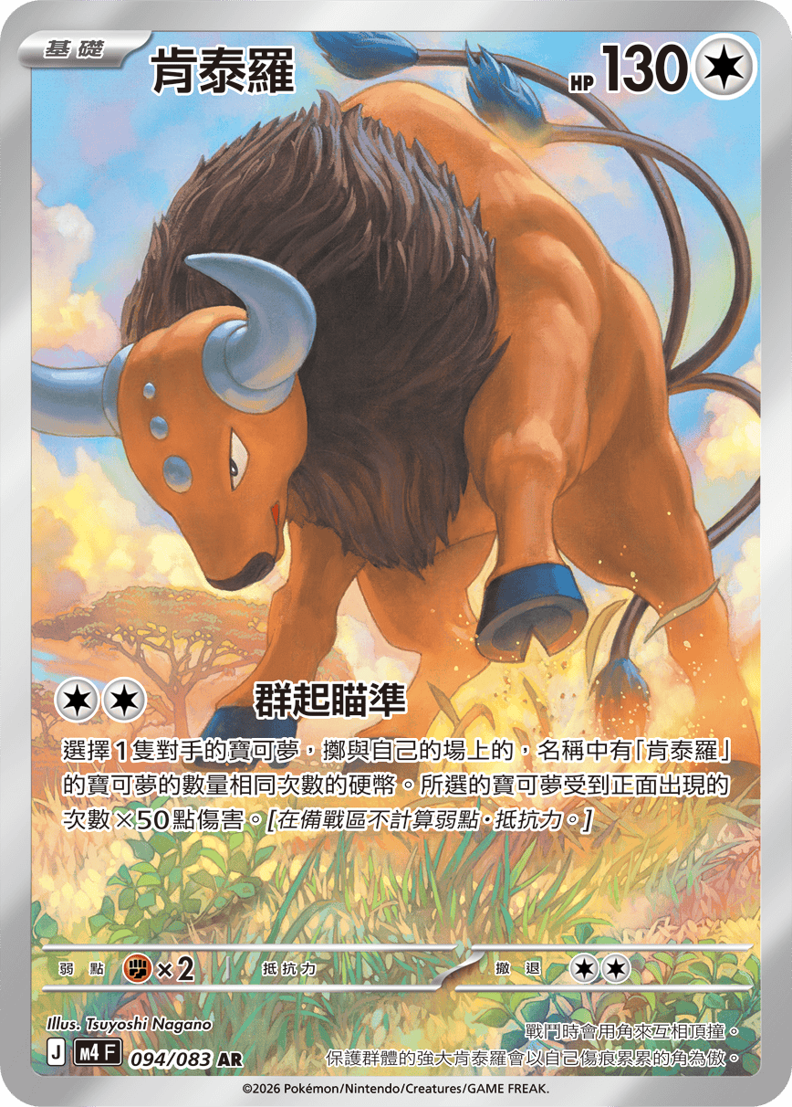 選擇1隻對手的寶可夢,擲與自己的場上的,名稱中有「肯泰羅」的寶可夢的數量相同次數的硬幣。所選的寶可夢受到正面出現的次數×50點傷害。[在備戰區不計算弱點・抵抗力。]