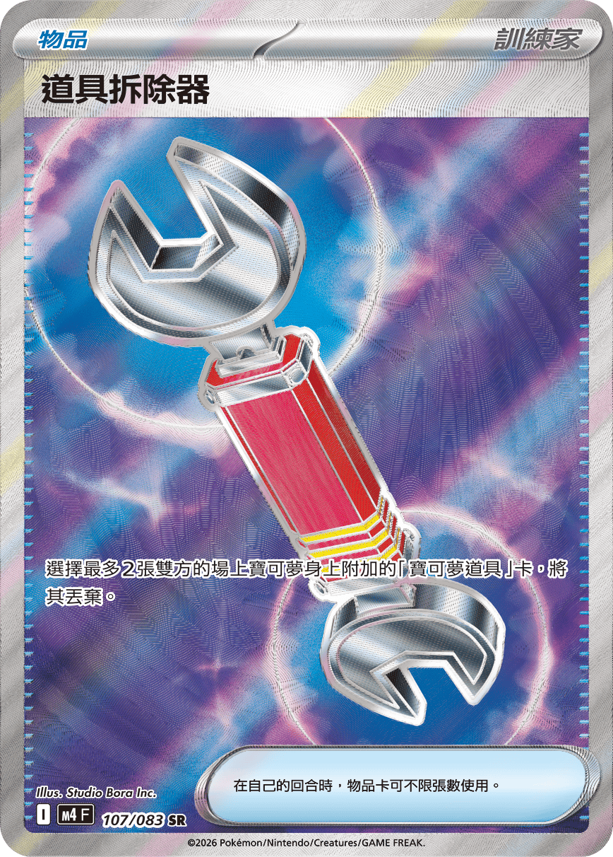 選擇最多2張雙方的場上寶可夢身上附加的「寶可夢道具」卡,將其丟棄。