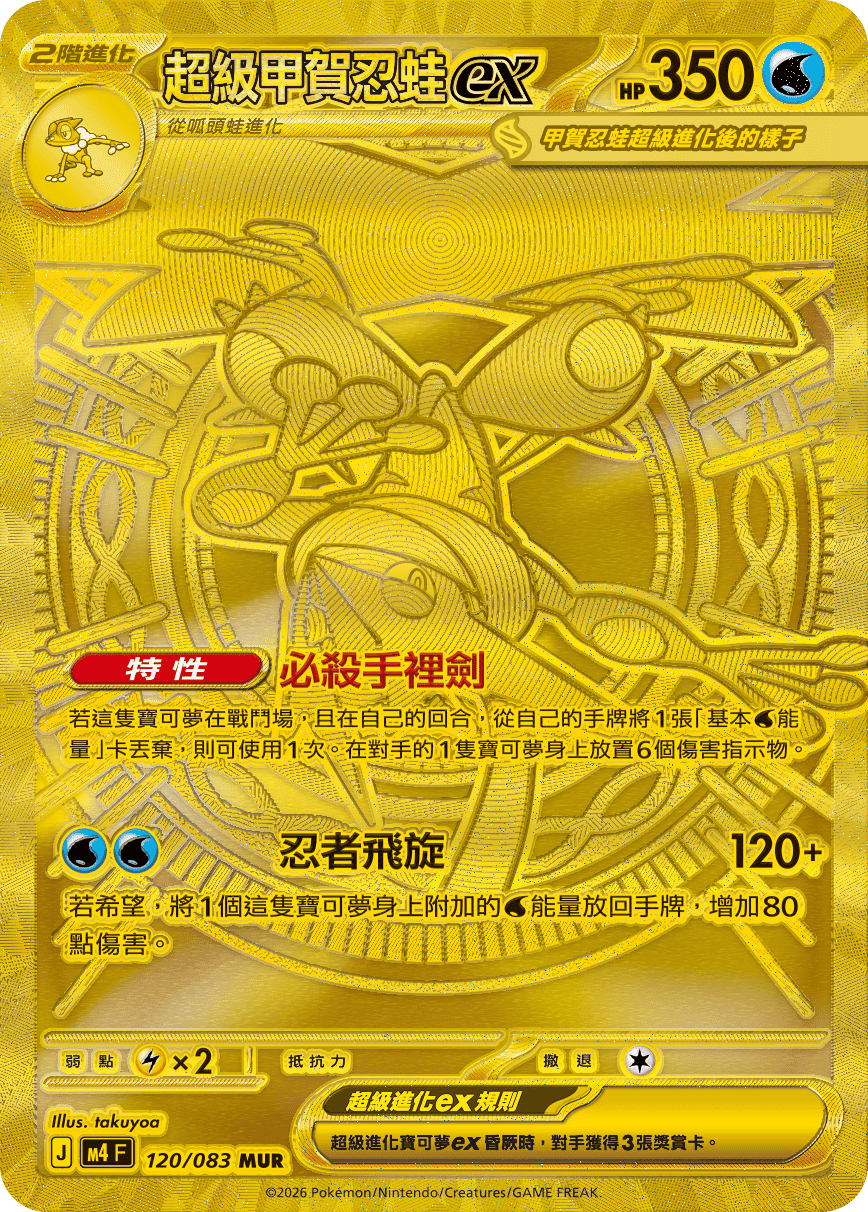 若這隻寶可夢在戰鬥場,且在自己的回合,從自己的手牌將1張「基本【水】能量」卡丟棄,則可使用1次。在對手的1隻寶可夢身上放置6個傷害指示物。