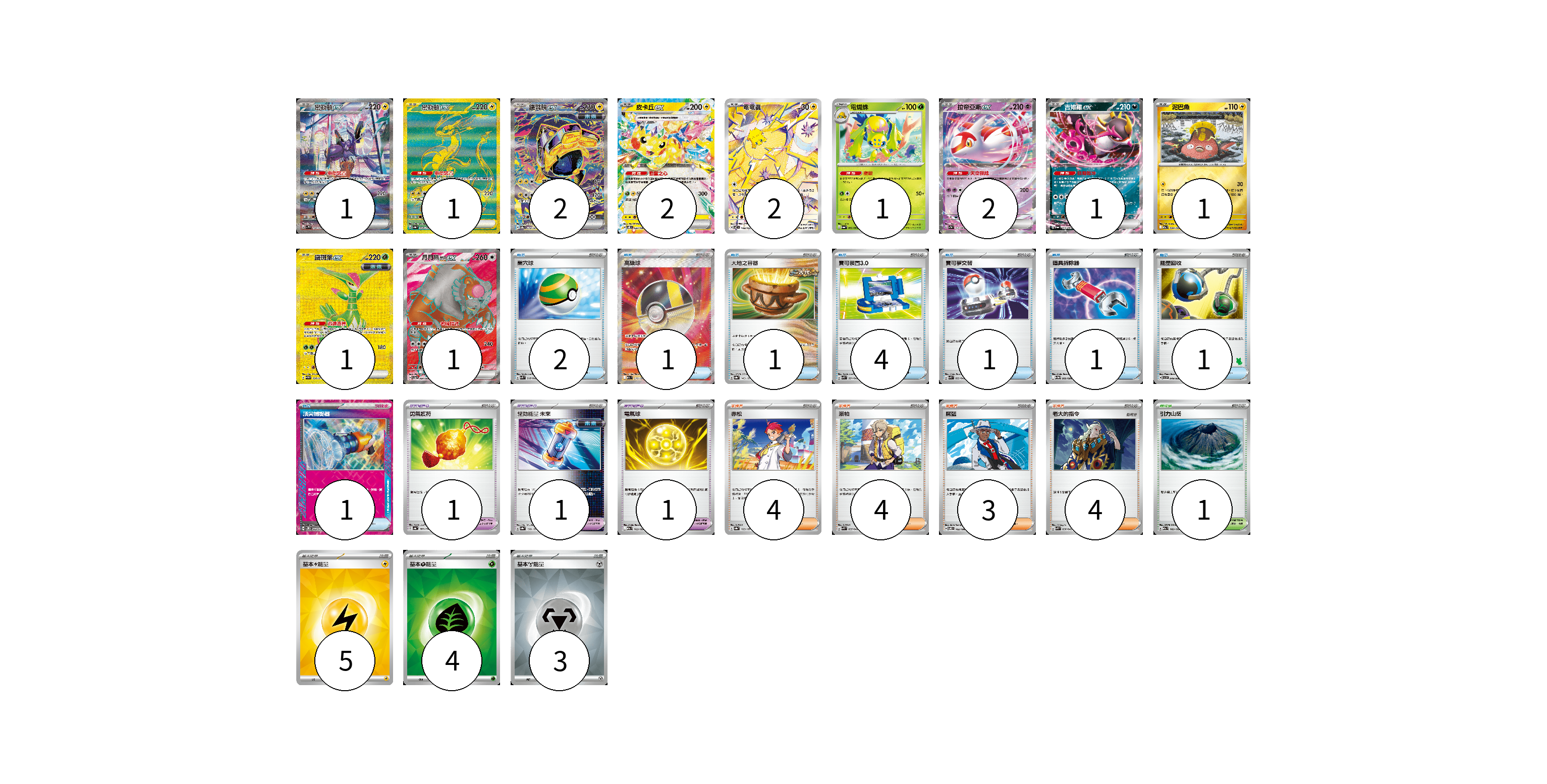 牌組構築方案 以此牌組為基礎新構築牌組 顯示卡面 顯示列表 寶可夢卡(15) 1 1 2 2 2 1 2 1 1 1 1 寶可夢道具(3) 1 1 1 物品卡(12) 2 1 1 4 1 1 1 1 支援者卡(15) 4 4 3 4 競技場卡(1) 1 能量卡(12) 5 4 3 寶可夢卡(15) 卡牌名稱 張數 卡牌名稱 張數 密勒頓ex SV1V 102/078 01 密勒頓ex SV4a 358/190 01 鐵臂膀ex SV8a 210/187 02 皮卡丘ex SV8 033/106 02 電電蟲 SV7 108/102 02 電蜘蛛 SV6a 002/064 01 拉帝亞斯ex SV7a 019/064 02 吉雉雞ex SV6a 038/064 01 泥巴魚 M2a 050/193 01 鐵斑葉ex SV5M 098/071 01 月月熊 赫月 ex SV5a 084/066 01 寶可夢道具(3) 卡牌名稱 張數 卡牌名稱 張數 勇氣護符 SV4a 169/190 01 驅勁能量 未來 SV8a 158/187 01 電氣球 M2a 163/193 01 物品卡(12) 卡牌名稱 張數 卡牌名稱 張數 巢穴球 SVK 016/042 02 高級球 M2a 216/193 01 大地之容器 SV8a 143/187 01 寶可裝置3.0 SVK 021/042 04 寶可夢交替 SVK 022/042 01 道具拆除器 SV11W 080/086 01 能量回收 SVI 049/066 01 頂尖捕捉器 SV5M 062/071 01 支援者卡(15) 卡牌名稱 張數 卡牌名稱 張數 赤松 SV8a 163/187 04 派帕 SVK 035/042 04 席藍 SV8 102/106 03 老大的指令 SVK 036/042 04 競技場卡(1) 卡牌名稱 張數 卡牌名稱 張數 引力山岳 M2a 183/193 01 能量卡(12) 卡牌名稱 張數 卡牌名稱 張數 基本【雷】能量 SVQP LIG 05 基本【草】能量 SVK GRA 04 基本【鋼】能量 SVK MET 03 以此牌組為基礎新構築牌組 牌組編碼 AAdvGr-cLthiE-XkoAGM copy 列印牌組單 牌組編碼已複製 分享至SNS