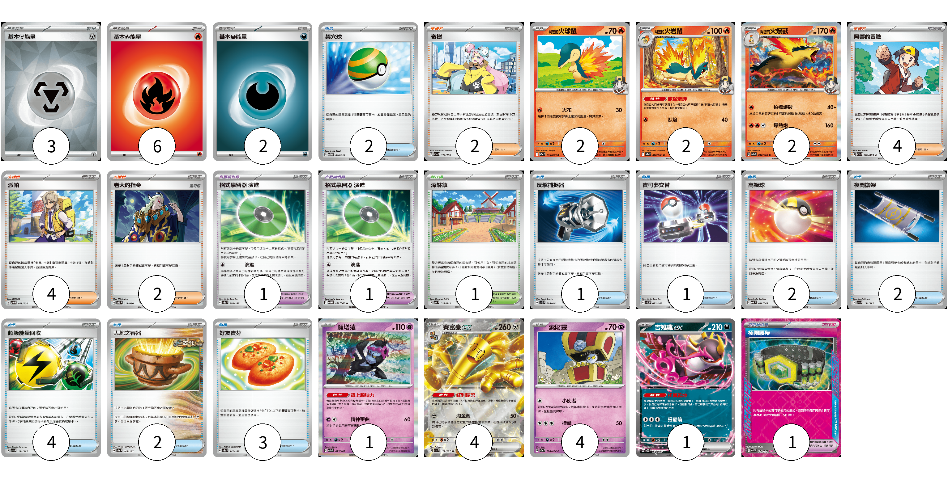 牌組構築方案 以此牌組為基礎新構築牌組 顯示卡面 顯示列表 寶可夢卡(16) 2 2 2 1 4 4 1 寶可夢道具(3) 1 1 1 物品卡(17) 2 1 1 2 2 4 2 3 支援者卡(12) 2 4 4 2 競技場卡(1) 1 能量卡(11) 3 6 2 寶可夢卡(16) 卡牌名稱 張數 卡牌名稱 張數 <阿響的>火球鼠 SV9a 015/063 02 <阿響的>火岩鼠 SV9a 016/063 02 <阿響的>火爆獸 SV9a 017/063 02 願增猿 SV8a 075/187 01 賽富豪ex SV8a 117/187 04 索財靈 SV7a 024/064 04 吉雉雞ex SVOD 004/020 01 寶可夢道具(3) 卡牌名稱 張數 卡牌名稱 張數 招式學習器 演進 SV8a 160/187 01 招式學習器 演進 SV4M 063/066 01 極限腰帶 SV5K 066/071 01 物品卡(17) 卡牌名稱 張數 卡牌名稱 張數 巢穴球 SVTH 010/018 02 反擊捕捉器 SVK 009/042 01 寶可夢交替 SVK 022/042 01 高級球 SVK 018/042 02 夜間擔架 SV8a 151/187 02 超級能量回收 SV8a 141/187 04 大地之容器 SV8a 143/187 02 好友寶芬 SV8a 147/187 03 支援者卡(12) 卡牌名稱 張數 卡牌名稱 張數 奇樹 SV4a 174/190 02 阿響的冒險 SV9a 063/063 04 派帕 SVOD 018/020 04 老大的指令 SVOD 019/020 02 競技場卡(1) 卡牌名稱 張數 卡牌名稱 張數 深缽鎮 SVK 039/042 01 能量卡(11) 卡牌名稱 張數 卡牌名稱 張數 基本【鋼】能量 SVOD MET 03 基本【火】能量 SVHK FIR 06 基本【惡】能量 SVB DAR 02 以此牌組為基礎新構築牌組 牌組編碼 ABjskU-qKnyOX-xOrwSY copy 列印牌組單 牌組編碼已複製 分享至SNS