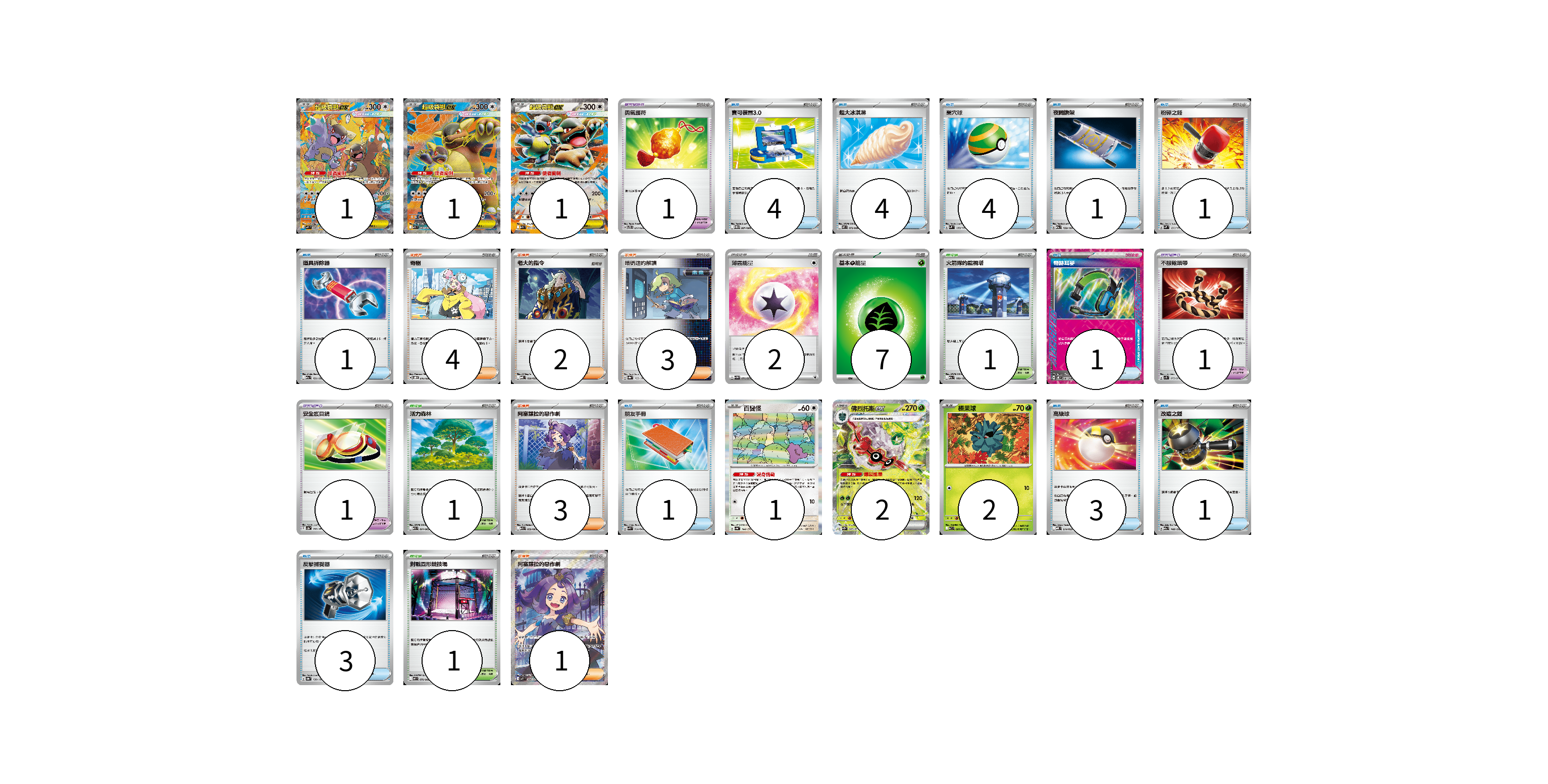 牌組構築方案 以此牌組為基礎新構築牌組 顯示卡面 顯示列表 寶可夢卡(8) 1 1 1 1 2 2 寶可夢道具(3) 1 1 1 物品卡(24) 4 4 4 1 1 1 1 1 3 1 3 支援者卡(13) 4 2 3 3 1 競技場卡(3) 1 1 1 能量卡(9) 2 7 寶可夢卡(8) 卡牌名稱 張數 卡牌名稱 張數 超級袋獸ex M1S 089/063 01 超級袋獸ex M1S 080/063 01 超級袋獸ex M1S 051/063 01 百變怪 SV4a 144/190 01 佛烈托斯ex SV2D 005/071 02 榛果球 SV10 001/098 02 寶可夢道具(3) 卡牌名稱 張數 卡牌名稱 張數 勇氣護符 SVTS 017/022 01 不服輸頭帶 SV1S 073/078 01 安全護目鏡 SV2a 157/165 01 物品卡(24) 卡牌名稱 張數 卡牌名稱 張數 寶可裝置3.0 SV11B 081/086 04 超大冰淇淋 M2 073/080 04 巢穴球 SVM 133/175 04 夜間擔架 M2a 159/193 01 粉碎之錘 SVM 131/175 01 道具拆除器 M2a 151/193 01 奇跡耳麥 SV8 097/106 01 朋友手冊 SVK 014/042 01 高級球 MBD 014/022 03 改造之錘 M2a 148/193 01 反擊捕捉器 SV8a 139/187 03 支援者卡(13) 卡牌名稱 張數 卡牌名稱 張數 奇樹 SVOD 016/020 04 老大的指令 MBD 020/022 02 暗碼迷的解讀 SV8a 165/187 03 阿塞蘿拉的惡作劇 M1S 059/063 03 阿塞蘿拉的惡作劇 M1S 084/063 01 競技場卡(3) 卡牌名稱 張數 卡牌名稱 張數 火箭隊的監視塔 M2a 189/193 01 活力森林 M1S 061/063 01 對戰圓形競技場 M2 079/080 01 能量卡(9) 卡牌名稱 張數 卡牌名稱 張數 薄霧能量 SV5M 071/071 02 基本【草】能量 M-P GRA 07 以此牌組為基礎新構築牌組 牌組編碼 AGGHuz-wbPBZV-BGskxE copy 列印牌組單 牌組編碼已複製 分享至SNS