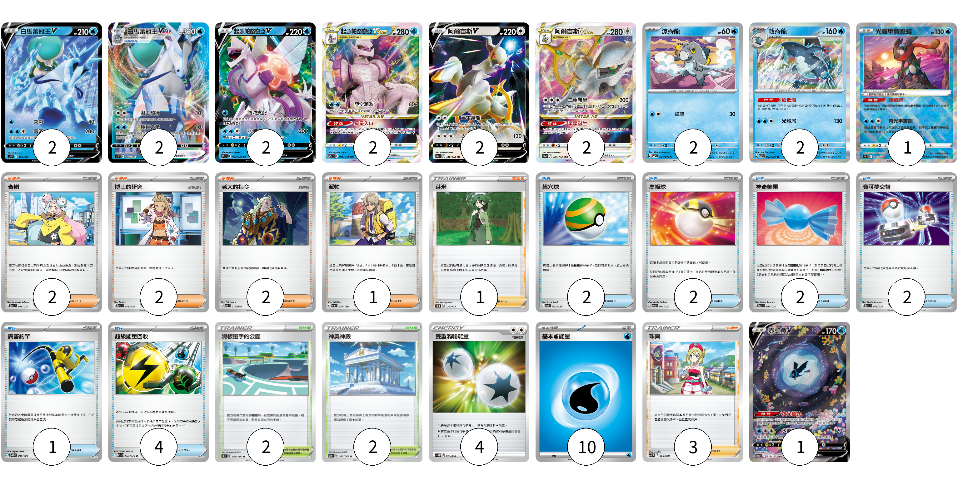 牌組構築方案 以此牌組為基礎新構築牌組 顯示卡面 顯示列表 寶可夢卡(18) 2 2 2 2 2 2 2 2 1 1 物品卡(13) 2 2 2 2 1 4 支援者卡(11) 2 2 2 1 1 3 競技場卡(4) 2 2 能量卡(14) 4 10 寶可夢卡(18) 卡牌名稱 張數 卡牌名稱 張數 白馬蕾冠王V SI 125/414 02 白馬蕾冠王VMAX SI 126/414 02 起源帕路奇亞V S12a 027/172 02 起源帕路奇亞VSTAR S12a 028/172 02 阿爾宙斯V S12a 126/172 02 阿爾宙斯VSTAR S12a 127/172 02 涼脊龍 SV2P 024/071 02 戟脊龍 SV2P 027/071 02 光輝甲賀忍蛙 S9a 026/067 01 霓虹魚V S12a 216/172 01 物品卡(13) 卡牌名稱 張數 卡牌名稱 張數 巢穴球 SVEM 012/020 02 高級球 SVEM 013/020 02 神奇糖果 SVEL 013/020 02 寶可夢交替 SVEL 015/020 02 厲害釣竿 SVEM 011/020 01 超級能量回收 SV1a 064/073 04 支援者卡(11) 卡牌名稱 張數 卡牌名稱 張數 奇樹 SVEL 016/020 02 博士的研究 SVEL 018/020 02 老大的指令 SVEL 019/020 02 派帕 SVD 137/139 01 芽米 SVB 025/028 01 珠貝 SVF 025/038 03 競技場卡(4) 卡牌名稱 張數 卡牌名稱 張數 滑板選手的公園 S8 099/100 02 神奧神殿 S10P 067/067 02 能量卡(14) 卡牌名稱 張數 卡牌名稱 張數 雙重渦輪能量 SVF 038/038 04 基本【水】能量 SVF WAT 10 以此牌組為基礎新構築牌組 牌組編碼 AOnWZb-taYCDI-cZyArc copy 列印牌組單 牌組編碼已複製 分享至SNS