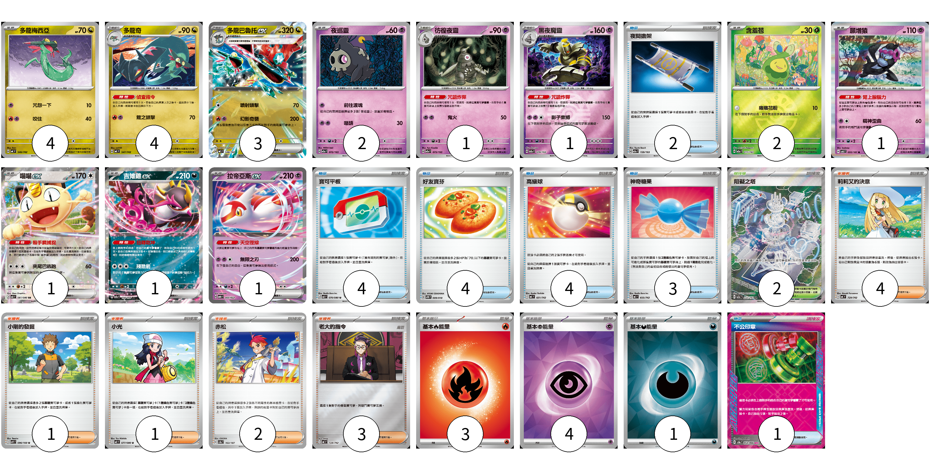 牌組構築方案 以此牌組為基礎新構築牌組 顯示卡面 顯示列表 寶可夢卡(21) 4 4 3 2 1 1 2 1 1 1 1 物品卡(18) 2 4 4 4 3 1 支援者卡(11) 4 1 1 2 3 競技場卡(2) 2 能量卡(8) 3 4 1 寶可夢卡(21) 卡牌名稱 張數 卡牌名稱 張數 多龍梅西亞 MC 546/742 04 多龍奇 MC 547/742 04 多龍巴魯托ex MC 548/742 03 夜巡靈 M2a 072/193 02 彷徨夜靈 M2a 073/193 01 黑夜魔靈 M2a 074/193 01 含羞苞 M2a 011/193 02 願增猿 SV6 055/101 01 喵喵ex M3 061/080 01 吉雉雞ex M2a 114/193 01 拉帝亞斯ex MBD 003/022 01 物品卡(18) 卡牌名稱 張數 卡牌名稱 張數 夜間擔架 M2a 159/193 02 寶可平板 M3 070/080 04 好友寶芬 SVTH 009/018 04 高級球 MC 651/742 04 神奇糖果 MC 655/742 03 不公印章 SV5a 053/066 01 支援者卡(11) 卡牌名稱 張數 卡牌名稱 張數 莉莉艾的決意 MC 729/742 04 小剛的發掘 SV9 096/100 01 小光 M2 077/080 01 赤松 SV8a 163/187 02 老大的指令 MC 724/742 03 競技場卡(2) 卡牌名稱 張數 卡牌名稱 張數 阻礙之塔 M2a 222/193 02 能量卡(8) 卡牌名稱 張數 卡牌名稱 張數 基本【火】能量 MC FIR 03 基本【超】能量 SVOD PSY 04 基本【惡】能量 SVOM DAR 01 以此牌組為基礎新構築牌組 牌組編碼 AQwJDp-WoKauD-IzVmYC copy 列印牌組單 牌組編碼已複製 分享至SNS