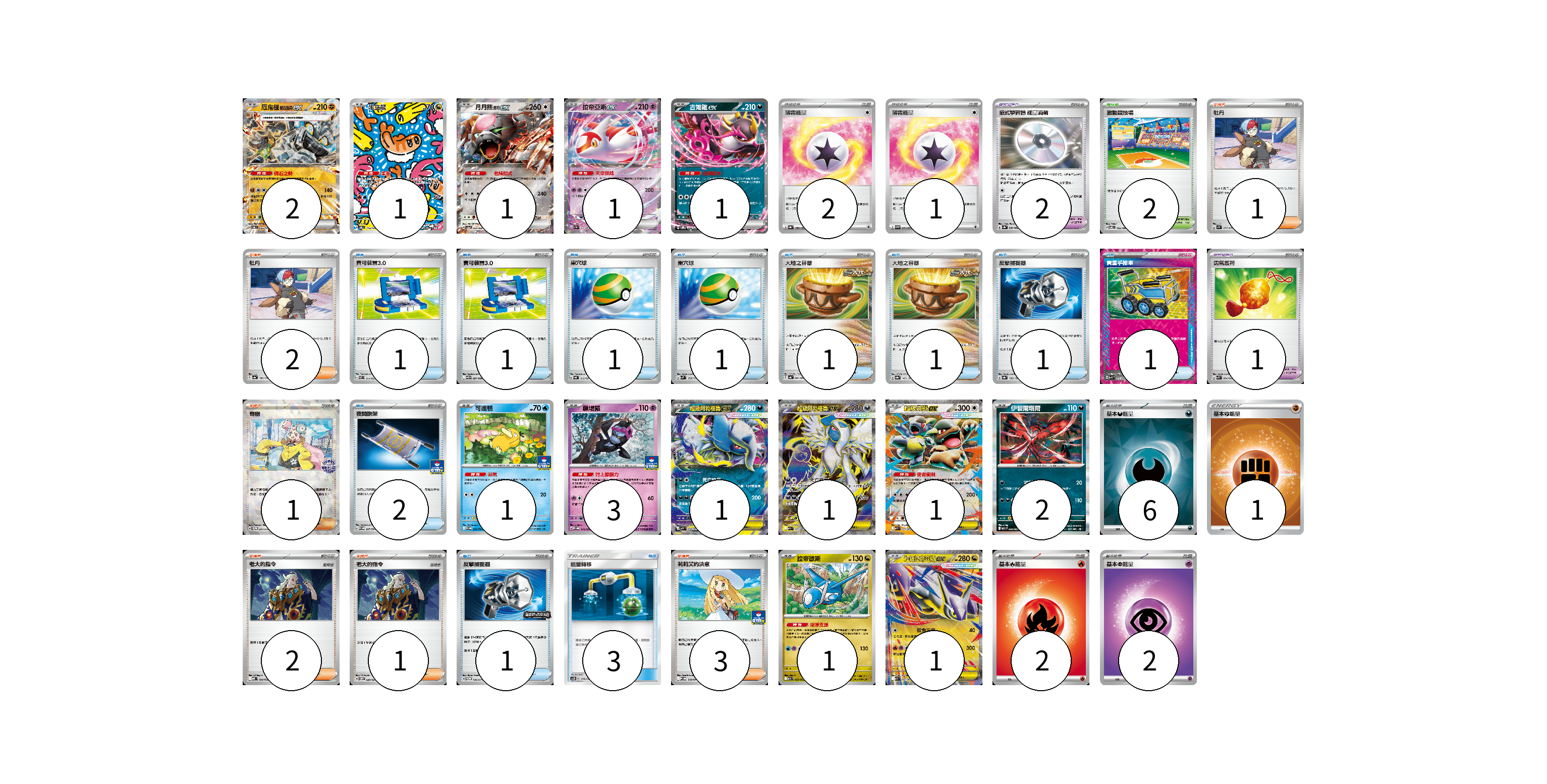 牌組構築方案 以此牌組為基礎新構築牌組 顯示卡面 顯示列表 寶可夢卡(17) 2 1 1 1 1 1 3 1 1 1 2 1 1 寶可夢道具(3) 2 1 物品卡(14) 1 1 1 1 1 1 1 1 2 1 3 支援者卡(10) 1 2 1 2 1 3 競技場卡(2) 2 能量卡(14) 2 1 6 1 2 2 寶可夢卡(17) 卡牌名稱 張數 卡牌名稱 張數 厄鬼椪 礎石面具ex SV6 065/101 02 米立龍 SV6 112/101 01 月月熊 赫月 ex SV5a 052/066 01 拉帝亞斯ex SV7a 019/064 01 吉雉雞ex SVOM 009/021 01 可達鴨 SV-P 220/SV-P 01 願增猿 M-P 014/M-P 03 超級阿勃梭魯ex M1L 038/063 01 超級阿勃梭魯ex M1L 079/063 01 超級袋獸ex M1S 051/063 01 伊裴爾塔爾 M1L 040/063 02 拉帝歐斯 M1S 050/063 01 超級拉帝亞斯ex M1S 049/063 01 寶可夢道具(3) 卡牌名稱 張數 卡牌名稱 張數 招式學習器 能量渦輪 SV3a 056/062 02 勇氣護符 SVK 024/042 01 物品卡(14) 卡牌名稱 張數 卡牌名稱 張數 寶可裝置3.0 SVEL 014/020 01 寶可裝置3.0 SV11B 081/086 01 巢穴球 SVAL 012/021 01 巢穴球 SVM 133/175 01 大地之容器 SV4K 060/066 01 大地之容器 SV8a 143/187 01 反擊捕捉器 SV8a 139/187 01 貴重手推車 SVK 020/042 01 夜間擔架 SV-P 227/SV-P 02 反擊捕捉器 SV-P 136/SV-P 01 能量轉移 AC2D 139/176 03 支援者卡(10) 卡牌名稱 張數 卡牌名稱 張數 牡丹 SV1S 077/078 01 牡丹 SV4a 182/190 02 奇樹 SV-P 247/SV-P 01 老大的指令 MBD 020/022 02 老大的指令 SVOM 020/021 01 莉莉艾的決意 M-P 018/M-P 03 競技場卡(2) 卡牌名稱 張數 卡牌名稱 張數 激動競技場 SV8 105/106 02 能量卡(14) 卡牌名稱 張數 卡牌名稱 張數 薄霧能量 SV8a 186/187 02 薄霧能量 SV5M 071/071 01 基本【惡】能量 SVOM DAR 06 基本【鬥】能量 SI FIG 01 基本【火】能量 M-P FIR 02 基本【超】能量 M-P PSY 02 以此牌組為基礎新構築牌組 牌組編碼 ASvqrB-fYzBxB-MuwdPR copy 列印牌組單 牌組編碼已複製 分享至SNS