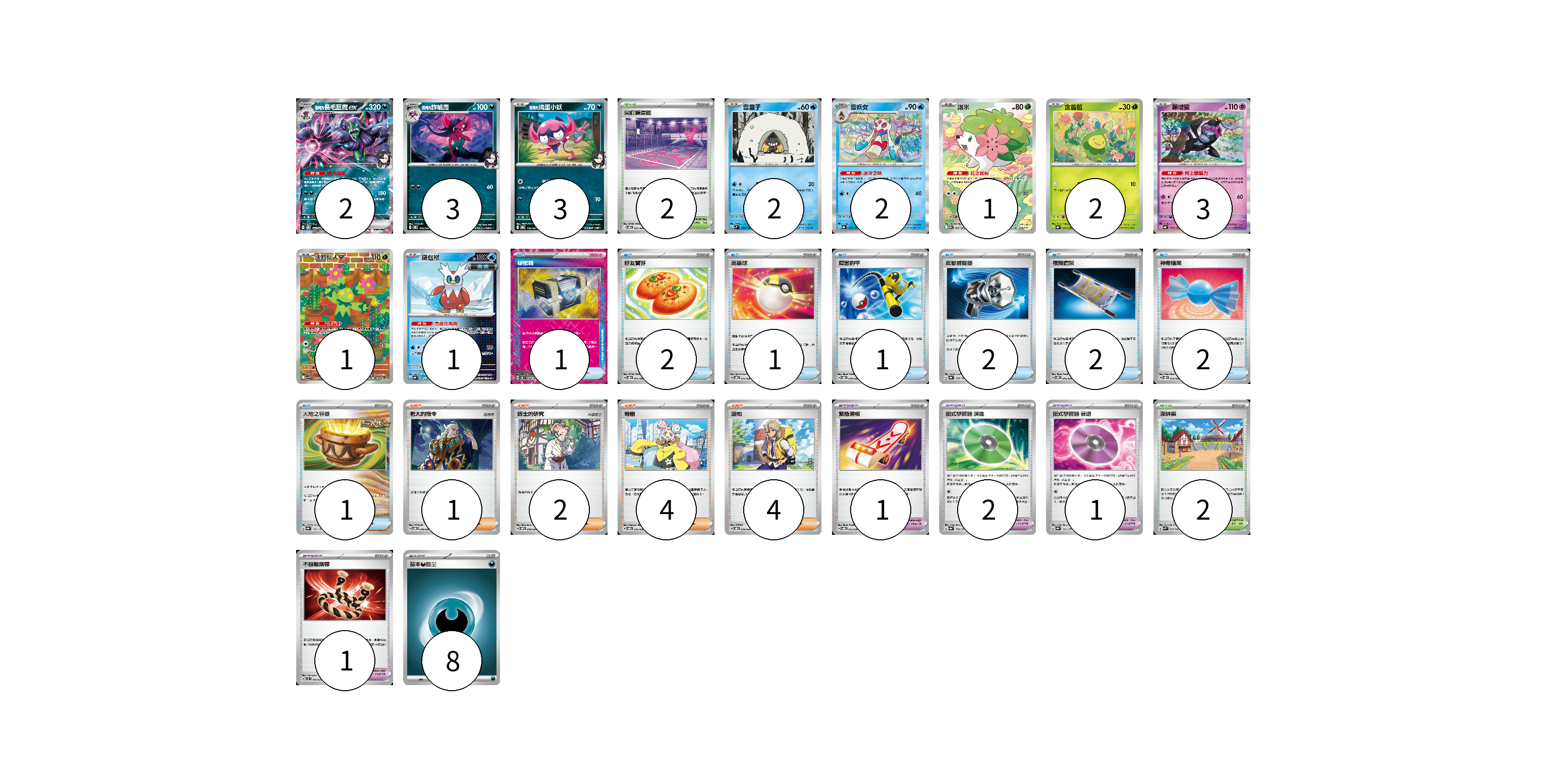 牌組構築方案 以此牌組為基礎新構築牌組 顯示卡面 顯示列表 寶可夢卡(20) 2 3 3 2 2 1 2 3 1 1 寶可夢道具(5) 1 2 1 1 物品卡(12) 1 2 1 1 2 2 2 1 支援者卡(11) 1 2 4 4 競技場卡(4) 2 2 能量卡(8) 8 寶可夢卡(20) 卡牌名稱 張數 卡牌名稱 張數 <瑪俐的>長毛巨魔ex SVOM 007/021 02 <瑪俐的>詐唬魔 SVOM 006/021 03 <瑪俐的>搗蛋小妖 SVOM 005/021 03 雪童子 SVM 034/175 02 雪妖女 SV8a 038/187 02 謝米 SV9a 066/063 01 含羞苞 SV8a 001/187 02 願增猿 SV8a 075/187 03 沙鈴仙人掌 SV9 101/100 01 鐵包袱 SV8a 047/187 01 寶可夢道具(5) 卡牌名稱 張數 卡牌名稱 張數 緊急滑板 SVOD 015/020 01 招式學習器 演進 SV8a 160/187 02 招式學習器 衰退 SV8a 161/187 01 不服輸頭帶 SVTL 016/021 01 物品卡(12) 卡牌名稱 張數 卡牌名稱 張數 秘密箱 SV6 092/101 01 好友寶芬 SVOD 011/020 02 高級球 SVOD 012/020 01 厲害釣竿 SVOD 010/020 01 反擊捕捉器 SV8a 139/187 02 夜間擔架 SVOM 016/021 02 神奇糖果 SVOD 013/020 02 大地之容器 SV8a 143/187 01 支援者卡(11) 卡牌名稱 張數 卡牌名稱 張數 老大的指令 SVOD 019/020 01 博士的研究 SVOM 019/021 02 奇樹 SVOD 016/020 04 派帕 SVOD 018/020 04 競技場卡(4) 卡牌名稱 張數 卡牌名稱 張數 尖釘鎮道館 SVOM 021/021 02 深缽鎮 SVK 039/042 02 能量卡(8) 卡牌名稱 張數 卡牌名稱 張數 基本惡能量 sv-p DAR 08 以此牌組為基礎新構築牌組 牌組編碼 ATzZFX-FUNjYZ-cesifj copy 列印牌組單 牌組編碼已複製 分享至SNS