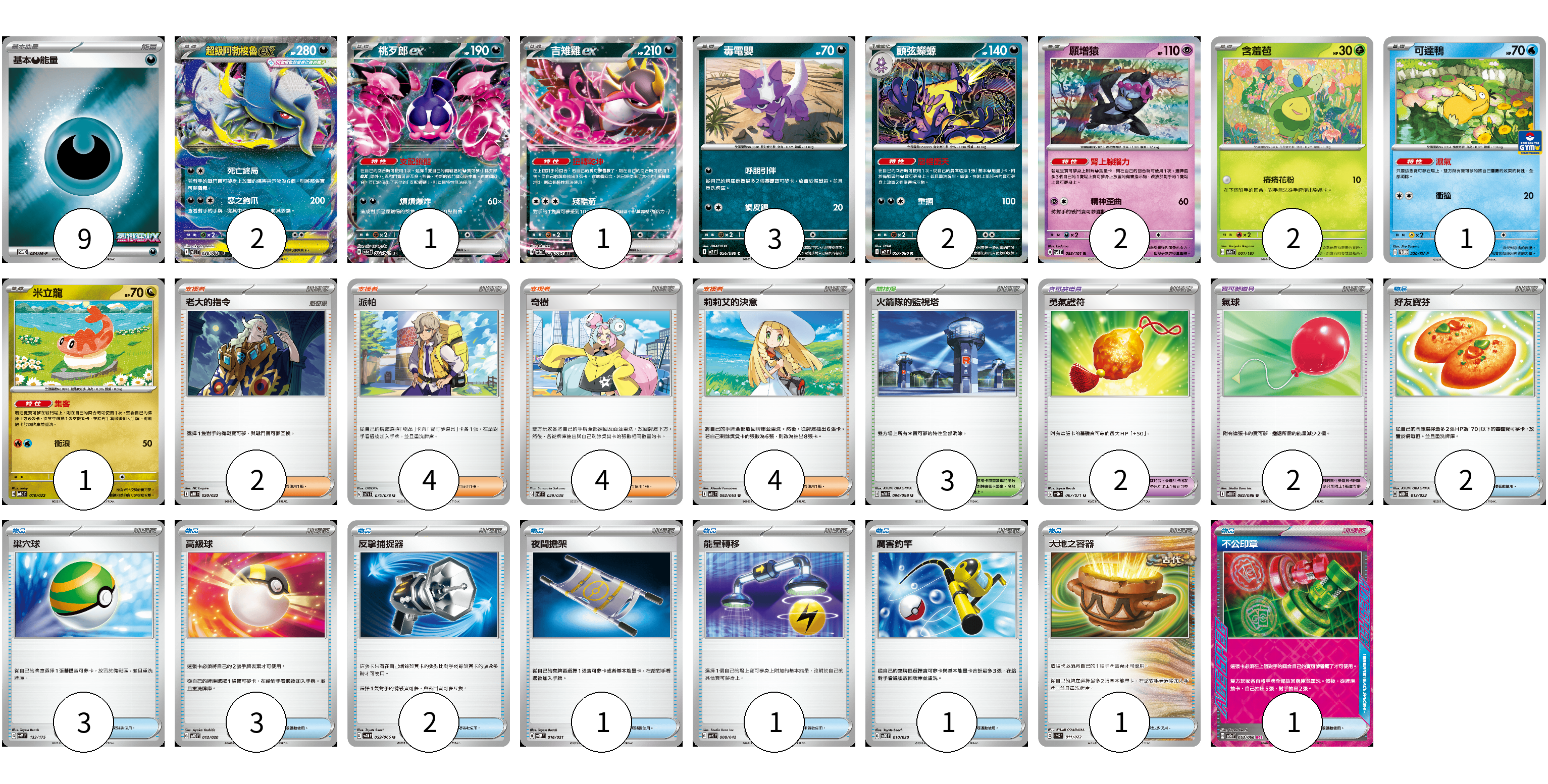 牌組構築方案 以此牌組為基礎新構築牌組 顯示卡面 顯示列表 寶可夢卡(15) 2 1 1 3 2 2 2 1 1 寶可夢道具(4) 2 2 物品卡(15) 2 3 3 2 1 1 1 1 1 支援者卡(14) 2 4 4 4 競技場卡(3) 3 能量卡(9) 9 寶可夢卡(15) 卡牌名稱 張數 卡牌名稱 張數 超級阿勃梭魯ex M1L 038/063 02 桃歹郎ex SV6a 039/064 01 吉雉雞ex SV6a 038/064 01 毒電嬰 M2 056/080 03 顫弦蠑螈 M2 057/080 02 願增猿 SV6 055/101 02 含羞苞 SV8a 001/187 02 可達鴨 SV-P 220/SV-P 01 米立龍 MBD 010/022 01 寶可夢道具(4) 卡牌名稱 張數 卡牌名稱 張數 勇氣護符 SV2D 067/071 02 氣球 SV11B 082/086 02 物品卡(15) 卡牌名稱 張數 卡牌名稱 張數 好友寶芬 MBD 013/022 02 巢穴球 SVM 133/175 03 高級球 SVOD 012/020 03 反擊捕捉器 SV4M 059/066 02 夜間擔架 SVOM 016/021 01 能量轉移 SVK 008/042 01 厲害釣竿 SVOD 010/020 01 大地之容器 SVHK 011/022 01 不公印章 SV5a 053/066 01 支援者卡(14) 卡牌名稱 張數 卡牌名稱 張數 老大的指令 MBD 020/022 02 派帕 SV1V 076/078 04 奇樹 SVF 029/038 04 莉莉艾的決意 M1L 062/063 04 競技場卡(3) 卡牌名稱 張數 卡牌名稱 張數 火箭隊的監視塔 SV10 096/098 03 能量卡(9) 卡牌名稱 張數 卡牌名稱 張數 基本【惡】能量 M-P 034/M-P 09 以此牌組為基礎新構築牌組 牌組編碼 AYJtBP-kWmtId-cuyukX copy 列印牌組單 牌組編碼已複製 分享至SNS