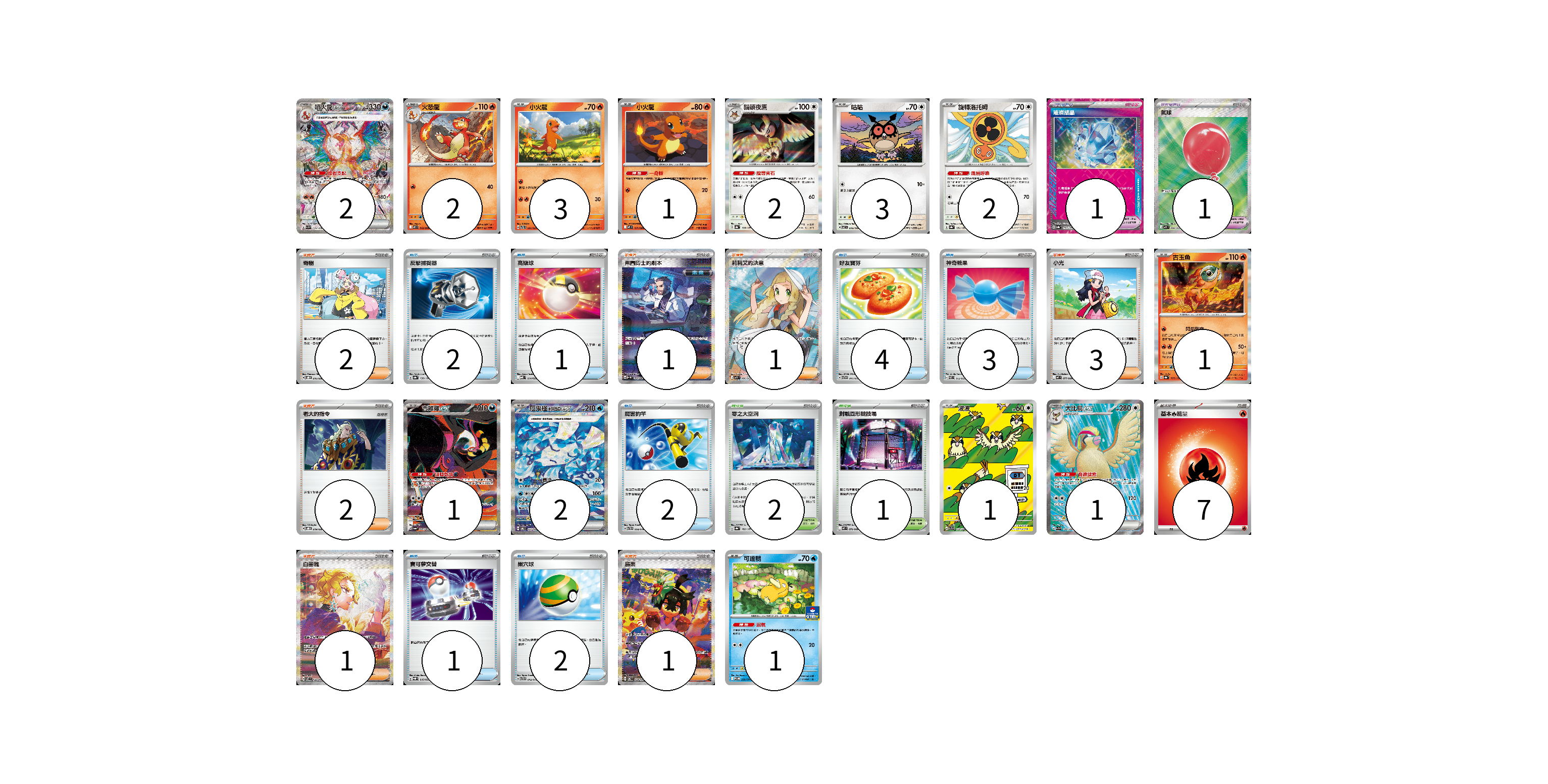 牌組構築方案 以此牌組為基礎新構築牌組 顯示卡面 顯示列表 寶可夢卡(22) 2 2 3 1 2 3 2 1 1 2 1 1 1 寶可夢道具(2) 1 1 物品卡(15) 2 1 4 3 2 1 2 支援者卡(11) 2 1 1 3 2 1 1 競技場卡(3) 2 1 能量卡(7) 7 寶可夢卡(22) 卡牌名稱 張數 卡牌名稱 張數 噴火龍ex SV3 134/108 02 火恐龍 M2 012/080 02 小火龍 SVTL 001/021 03 小火龍 M2 011/080 01 貓頭夜鷹 SV8a 128/187 02 咕咕 SV7 076/102 03 旋轉洛托姆 SV8a 131/187 02 古玉魚 SV8a 025/187 01 吉雉雞ex SV6a 089/064 01 厄鬼椪 水井面具ex SV6 127/101 02 波波 SV3 118/108 01 大比鳥ex SV3 128/108 01 可達鴨 SV-P 220/SV-P 01 寶可夢道具(2) 卡牌名稱 張數 卡牌名稱 張數 璀璨結晶 SV8a 152/187 01 氣球 M1L 084/063 01 物品卡(15) 卡牌名稱 張數 卡牌名稱 張數 反擊捕捉器 SV8a 139/187 02 高級球 MBD 014/022 01 好友寶芬 SVTG 011/019 04 神奇糖果 SVEL 013/020 03 厲害釣竿 SVTH 008/018 02 寶可夢交替 SVQP 016/023 01 巢穴球 SVTG 012/019 02 支援者卡(11) 卡牌名稱 張數 卡牌名稱 張數 奇樹 SVOD 016/020 02 弗圖博士的劇本 SV4M 091/066 01 莉莉艾的決意 M1L 086/063 01 小光 M2 077/080 03 老大的指令 SVOD 019/020 02 白蕾雅 SV7 132/102 01 烏栗 SV6 129/101 01 競技場卡(3) 卡牌名稱 張數 卡牌名稱 張數 零之大空洞 SV8a 182/187 02 對戰圓形競技場 M2 079/080 01 能量卡(7) 卡牌名稱 張數 卡牌名稱 張數 基本【火】能量 M-P FIR 07 以此牌組為基礎新構築牌組 牌組編碼 AZoWqK-uoZnwG-tJDRWM copy 列印牌組單 牌組編碼已複製 分享至SNS