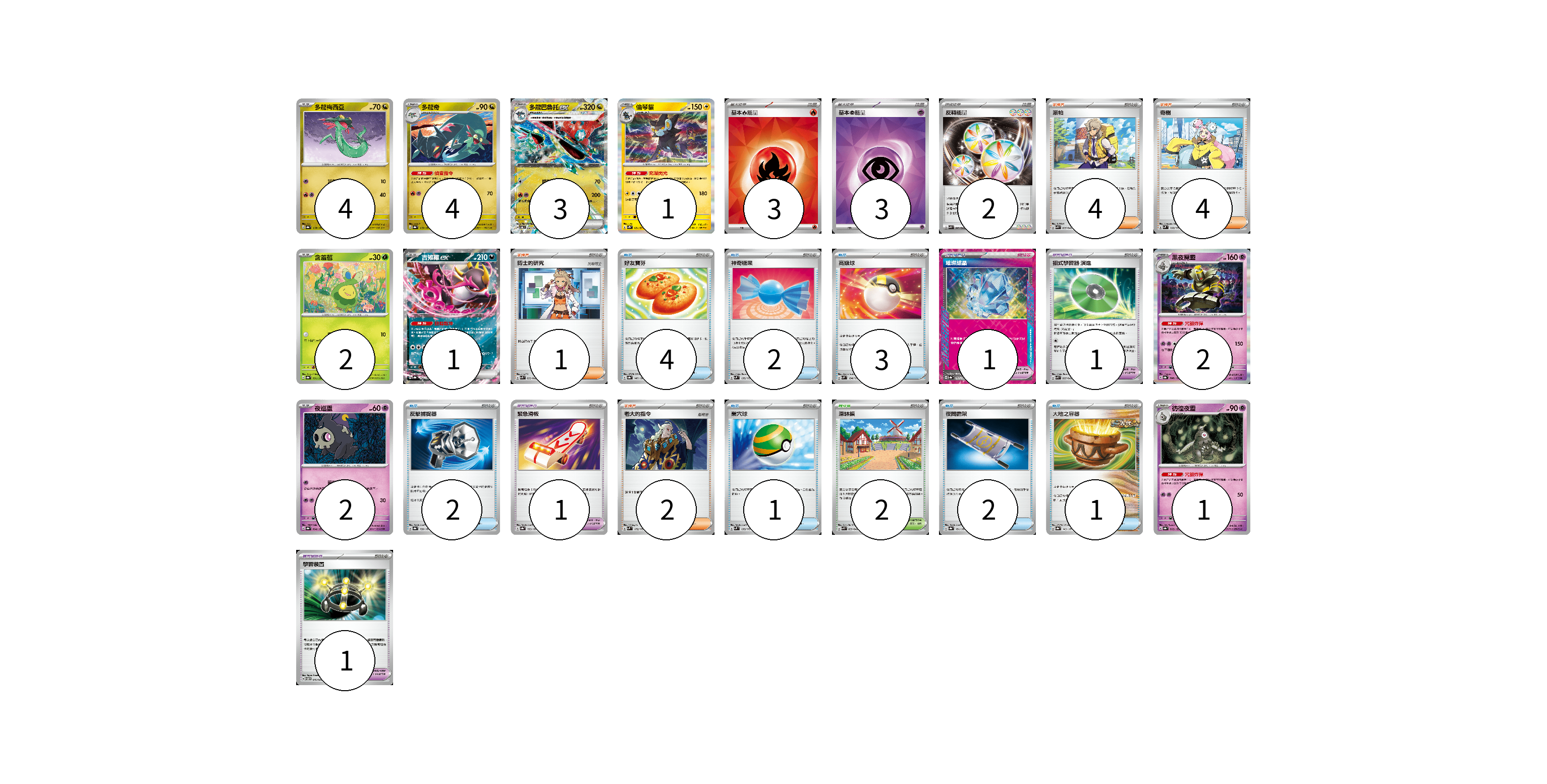 牌組構築方案 以此牌組為基礎新構築牌組 顯示卡面 顯示列表 寶可夢卡(20) 4 4 3 1 2 1 2 2 1 寶可夢道具(4) 1 1 1 1 物品卡(15) 4 2 3 2 1 2 1 支援者卡(11) 4 4 1 2 競技場卡(2) 2 能量卡(8) 3 3 2 寶可夢卡(20) 卡牌名稱 張數 卡牌名稱 張數 多龍梅西亞 SV8a 118/187 04 多龍奇 SV8a 119/187 04 多龍巴魯托ex SV6 081/101 03 倫琴貓 SV2D 021/071 01 含羞苞 SV8a 001/187 02 吉雉雞ex SV8a 104/187 01 黑夜魔靈 SV8a 066/187 02 夜巡靈 SV8a 064/187 02 彷徨夜靈 SV8a 065/187 01 寶可夢道具(4) 卡牌名稱 張數 卡牌名稱 張數 璀璨結晶 SV8a 152/187 01 招式學習器 演進 SVK 025/042 01 緊急滑板 SV8a 153/187 01 學習裝置 SVTM 016/022 01 物品卡(15) 卡牌名稱 張數 卡牌名稱 張數 好友寶芬 SV8a 147/187 04 神奇糖果 SVM 135/175 02 高級球 SVM 134/175 03 反擊捕捉器 SV8a 139/187 02 巢穴球 SVM 133/175 01 夜間擔架 SV8a 151/187 02 大地之容器 SV8a 143/187 01 支援者卡(11) 卡牌名稱 張數 卡牌名稱 張數 派帕 SVK 035/042 04 奇樹 SVM 160/175 04 博士的研究 SVK 032/042 01 老大的指令 SVM 172/175 02 競技場卡(2) 卡牌名稱 張數 卡牌名稱 張數 深缽鎮 SVK 039/042 02 能量卡(8) 卡牌名稱 張數 卡牌名稱 張數 基本【火】能量 SVM FIR 03 基本【超】能量 SVM PSY 03 反轉能量 SVK 041/042 02 以此牌組為基礎新構築牌組 牌組編碼 AiYaFz-kmNahu-ickcDM copy 列印牌組單 牌組編碼已複製 分享至SNS