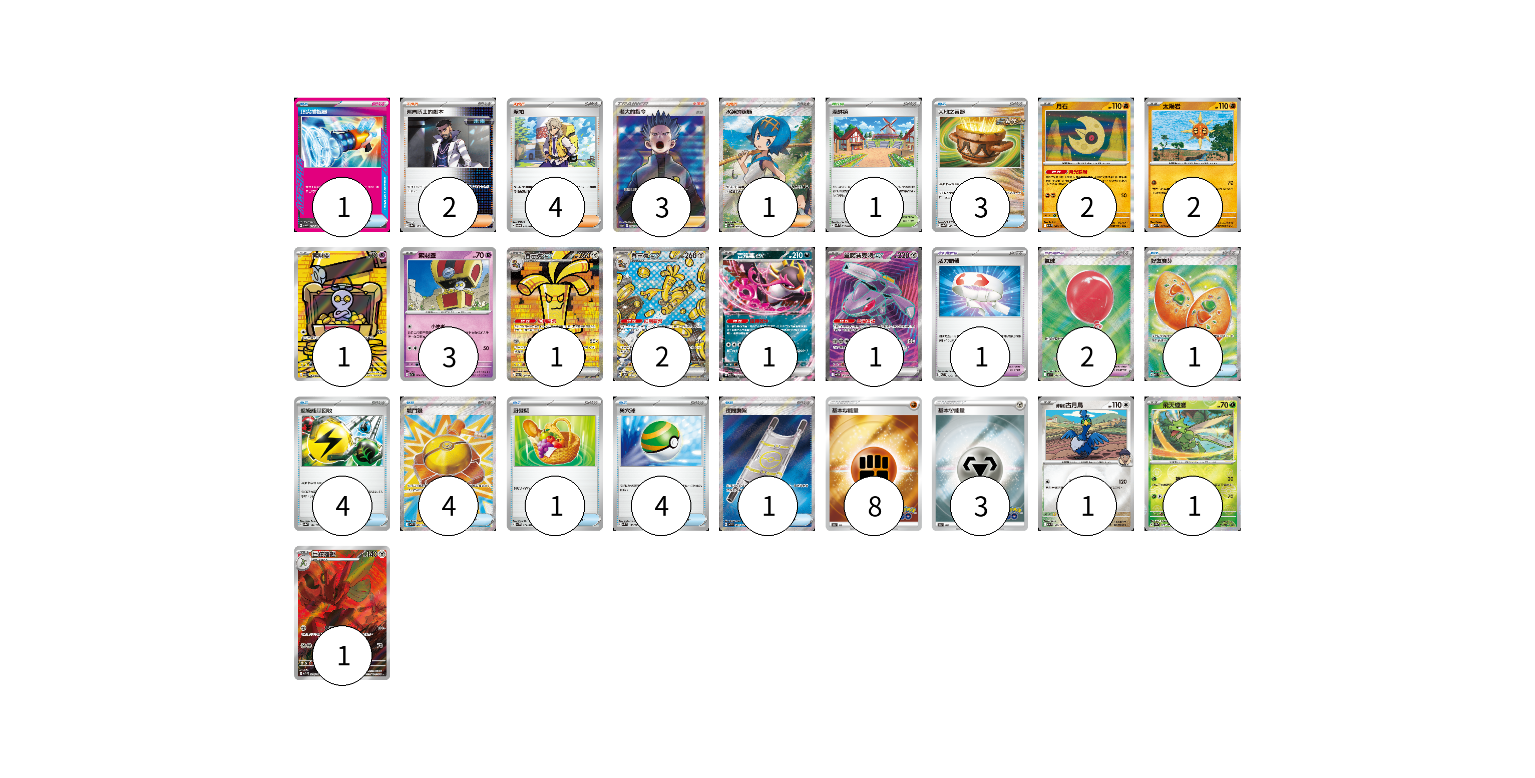 牌組構築方案 以此牌組為基礎新構築牌組 顯示卡面 顯示列表 寶可夢卡(16) 2 2 1 3 1 2 1 1 1 1 1 寶可夢道具(3) 1 2 物品卡(19) 1 3 1 4 4 1 4 1 支援者卡(10) 2 4 3 1 競技場卡(1) 1 能量卡(11) 8 3 寶可夢卡(16) 卡牌名稱 張數 卡牌名稱 張數 月石 M2a 086/193 02 太陽岩 M1L 027/063 02 索財靈 SV3a 068/062 01 索財靈 SV7a 024/064 03 賽富豪ex SV3a 087/062 01 賽富豪ex SV8a 220/187 02 吉雉雞ex M2a 114/193 01 蓋諾賽克特ex SV11B 164/086 01 赫普的古月鳥 M2a 143/193 01 飛天螳螂 SV2a 123/165 01 巨鉗螳螂 SV3 116/108 01 寶可夢道具(3) 卡牌名稱 張數 卡牌名稱 張數 活力頭帶 SVD 125/139 01 氣球 M1L 084/063 02 物品卡(19) 卡牌名稱 張數 卡牌名稱 張數 頂尖捕捉器 MBG 014/022 01 大地之容器 SV8a 143/187 03 好友寶芬 M1S 081/063 01 超級能量回收 SV8a 141/187 04 戰鬥鑼 M1L 082/063 04 野餐籃 SV1V 071/078 01 巢穴球 SVM 133/175 04 夜間擔架 M1L 083/063 01 支援者卡(10) 卡牌名稱 張數 卡牌名稱 張數 弗圖博士的劇本 SV8a 175/187 02 派帕 SVOD 018/020 04 老大的指令(赤日) S12a 250/172 03 水蓮的照顧 SV5a 088/066 01 競技場卡(1) 卡牌名稱 張數 卡牌名稱 張數 深缽鎮 SVK 039/042 01 能量卡(11) 卡牌名稱 張數 卡牌名稱 張數 基本鬥能量 S10b FIG 08 基本鋼能量 S10b MET 03 以此牌組為基礎新構築牌組 牌組編碼 AjgXgR-letktB-vJJAty copy 列印牌組單 牌組編碼已複製 分享至SNS