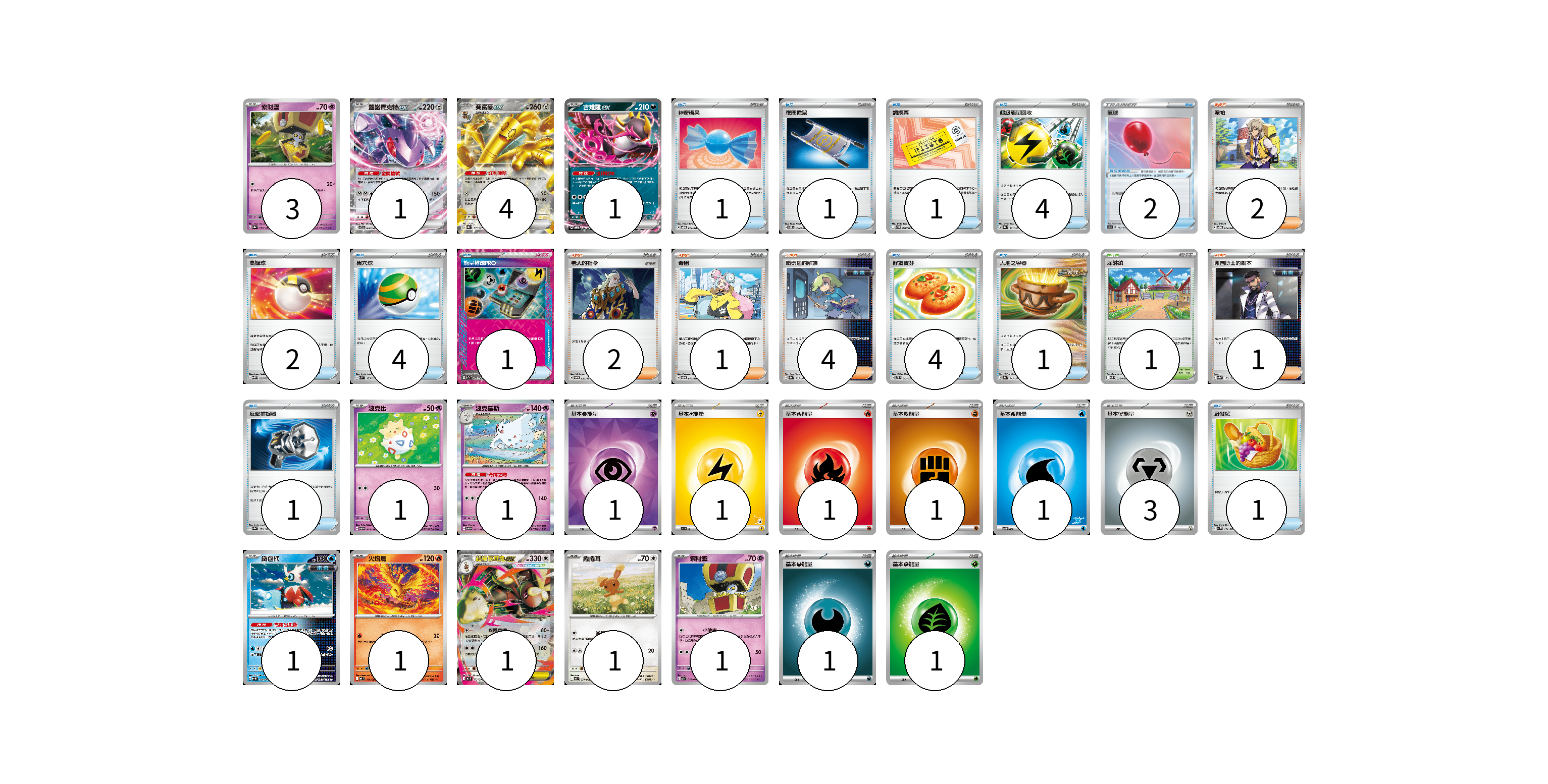 牌組構築方案 以此牌組為基礎新構築牌組 顯示卡面 顯示列表 寶可夢卡(16) 3 1 4 1 1 1 1 1 1 1 1 寶可夢道具(2) 2 物品卡(21) 1 1 1 4 2 4 1 4 1 1 1 支援者卡(10) 2 2 1 4 1 競技場卡(1) 1 能量卡(10) 1 1 1 1 1 3 1 1 寶可夢卡(16) 卡牌名稱 張數 卡牌名稱 張數 索財靈 SV8a 073/187 03 蓋諾賽克特ex SV11B 069/086 01 賽富豪ex SV8a 117/187 04 吉雉雞ex SVOM 009/021 01 波克比 SV8 045/106 01 波克基斯 SV8 047/106 01 鐵包袱 SV4M 020/066 01 火焰鳥 M2 014/080 01 超級長耳兔ex M2 072/080 01 捲捲耳 M2 071/080 01 索財靈 SV7a 024/064 01 寶可夢道具(2) 卡牌名稱 張數 卡牌名稱 張數 氣球 SC1b 142/153 02 物品卡(21) 卡牌名稱 張數 卡牌名稱 張數 神奇糖果 SVOD 013/020 01 夜間擔架 SVOM 016/021 01 調換票 SV9 090/100 01 超級能量回收 SV8a 141/187 04 高級球 SVQP 015/023 02 巢穴球 SVM 133/175 04 能量輸送PRO SV7a 052/064 01 好友寶芬 SVTS 012/022 04 大地之容器 SV8a 143/187 01 反擊捕捉器 SV8a 139/187 01 野餐籃 SV1V 071/078 01 支援者卡(10) 卡牌名稱 張數 卡牌名稱 張數 派帕 SVOD 018/020 02 老大的指令 SVOM 020/021 02 奇樹 SVOD 016/020 01 暗碼迷的解讀 SV8a 165/187 04 弗圖博士的劇本 SV8a 175/187 01 競技場卡(1) 卡牌名稱 張數 卡牌名稱 張數 深缽鎮 SVF 036/038 01 能量卡(10) 卡牌名稱 張數 卡牌名稱 張數 基本【超】能量 SVOD PSY 01 基本【雷】能量 SVI LIG 01 基本【火】能量 SVTL FIR 01 基本【鬥】能量 SVTG FIG 01 基本【水】能量 SVI WAT 01 基本【鋼】能量 SVTH MET 03 基本【惡】能量 M-P DAR 01 基本【草】能量 M-P GRA 01 以此牌組為基礎新構築牌組 牌組編碼 AnuvbR-hLTfOA-jbFoRW copy 列印牌組單 牌組編碼已複製 分享至SNS