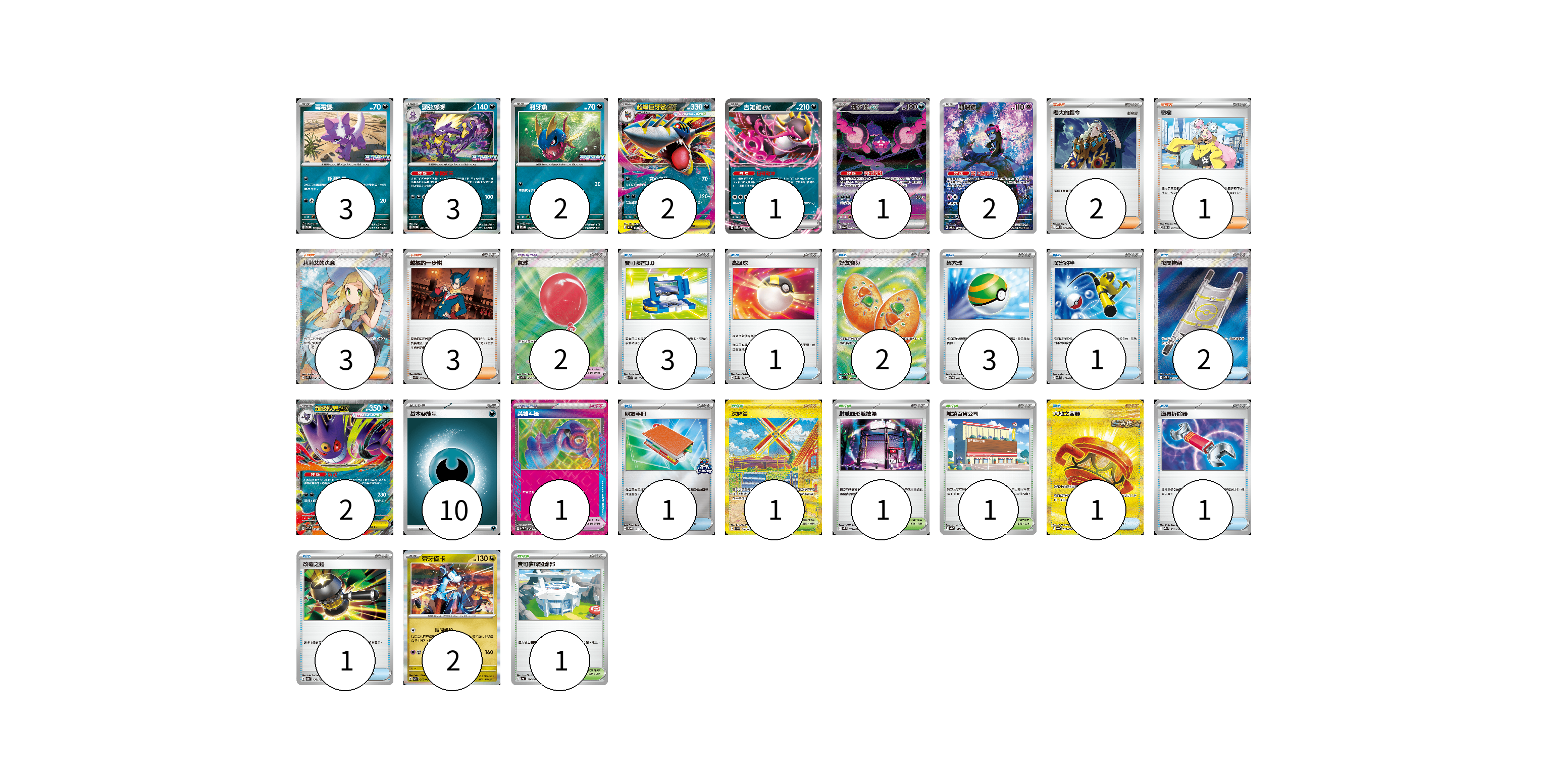 牌組構築方案 以此牌組為基礎新構築牌組 顯示卡面 顯示列表 寶可夢卡(18) 3 3 2 2 1 1 2 2 2 寶可夢道具(3) 2 1 物品卡(16) 3 1 2 3 1 2 1 1 1 1 支援者卡(9) 2 1 3 3 競技場卡(4) 1 1 1 1 能量卡(10) 10 寶可夢卡(18) 卡牌名稱 張數 卡牌名稱 張數 毒電嬰 M-P 027/M-P 03 顫弦蠑螈 M-P 031/M-P 03 利牙魚 M-P 026/M-P 02 超級巨牙鯊ex M2 051/080 02 吉雉雞ex SVOM 009/021 01 桃歹郎ex SV6a 090/064 01 願增猿 SV6 107/101 02 超級耿鬼ex MBG 003/022 02 帝牙盧卡 SV7a 042/064 02 寶可夢道具(3) 卡牌名稱 張數 卡牌名稱 張數 氣球 M1L 084/063 02 英雄斗篷 SV5M 064/071 01 物品卡(16) 卡牌名稱 張數 卡牌名稱 張數 寶可裝置3.0 SVK 021/042 03 高級球 SVQL 015/022 01 好友寶芬 M1S 081/063 02 巢穴球 SVTG 012/019 03 厲害釣竿 SVK 011/042 01 夜間擔架 M1L 083/063 02 朋友手冊 SV-P 182/SV-P 01 大地之容器 SV6a 093/064 01 道具拆除器 M2a 151/193 01 改造之錘 SV8a 138/187 01 支援者卡(9) 卡牌名稱 張數 卡牌名稱 張數 老大的指令 MBD 020/022 02 奇樹 SVTM 017/022 01 莉莉艾的決意 M1L 086/063 03 越橘的一步棋 M2 076/080 03 競技場卡(4) 卡牌名稱 張數 卡牌名稱 張數 深缽鎮 SV3 140/108 01 對戰圓形競技場 M2 079/080 01 城鎮百貨公司 SV4a 183/190 01 寶可夢聯盟總部 SV4a 186/190 01 能量卡(10) 卡牌名稱 張數 卡牌名稱 張數 基本【惡】能量 MBG DAR 10 以此牌組為基礎新構築牌組 牌組編碼 AtyzIy-okLsCj-jbpqYZ copy 列印牌組單 牌組編碼已複製 分享至SNS