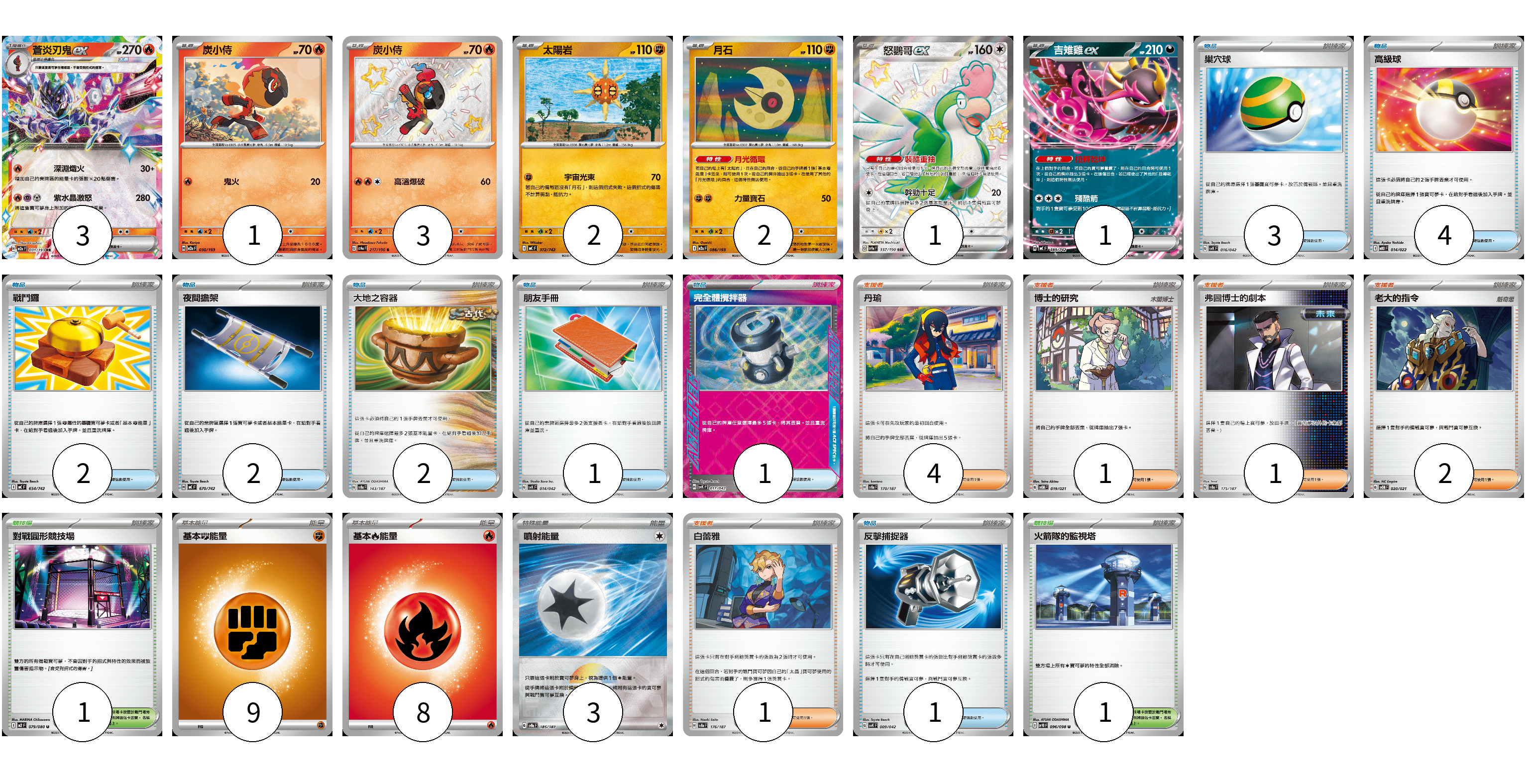 牌組構築方案 以此牌組為基礎新構築牌組 顯示卡面 顯示列表 寶可夢卡(13) 3 1 3 2 2 1 1 物品卡(16) 3 4 2 2 2 1 1 1 支援者卡(9) 4 1 1 2 1 競技場卡(2) 1 1 能量卡(20) 9 8 3 寶可夢卡(13) 卡牌名稱 張數 卡牌名稱 張數 蒼炎刃鬼ex M2a 031/193 03 炭小侍 M2a 030/193 01 炭小侍 SV4a 217/190 03 太陽岩 MC 372/742 02 月石 M2a 086/193 02 怒鸚哥ex SV4a 337/190 01 吉雉雞ex MC 489/742 01 物品卡(16) 卡牌名稱 張數 卡牌名稱 張數 巢穴球 SVK 016/042 03 高級球 MBD 014/022 04 戰鬥鑼 MC 654/742 02 夜間擔架 MC 670/742 02 大地之容器 SV8a 143/187 02 朋友手冊 SVK 014/042 01 完全體攪拌器 SVK 017/042 01 反擊捕捉器 SVK 009/042 01 支援者卡(9) 卡牌名稱 張數 卡牌名稱 張數 丹瑜 SV8a 170/187 04 博士的研究 SVOM 019/021 01 弗圖博士的劇本 SV8a 175/187 01 老大的指令 SVOM 020/021 02 白蕾雅 SV8a 176/187 01 競技場卡(2) 卡牌名稱 張數 卡牌名稱 張數 對戰圓形競技場 M2 079/080 01 火箭隊的監視塔 SV10 096/098 01 能量卡(20) 卡牌名稱 張數 卡牌名稱 張數 基本【鬥】能量 MC FIG 09 基本【火】能量 MC FIR 08 噴射能量 SV8a 185/187 03 以此牌組為基礎新構築牌組 牌組編碼 AyKqye-ZgKCaf-INIQzB copy 列印牌組單 牌組編碼已複製 分享至SNS