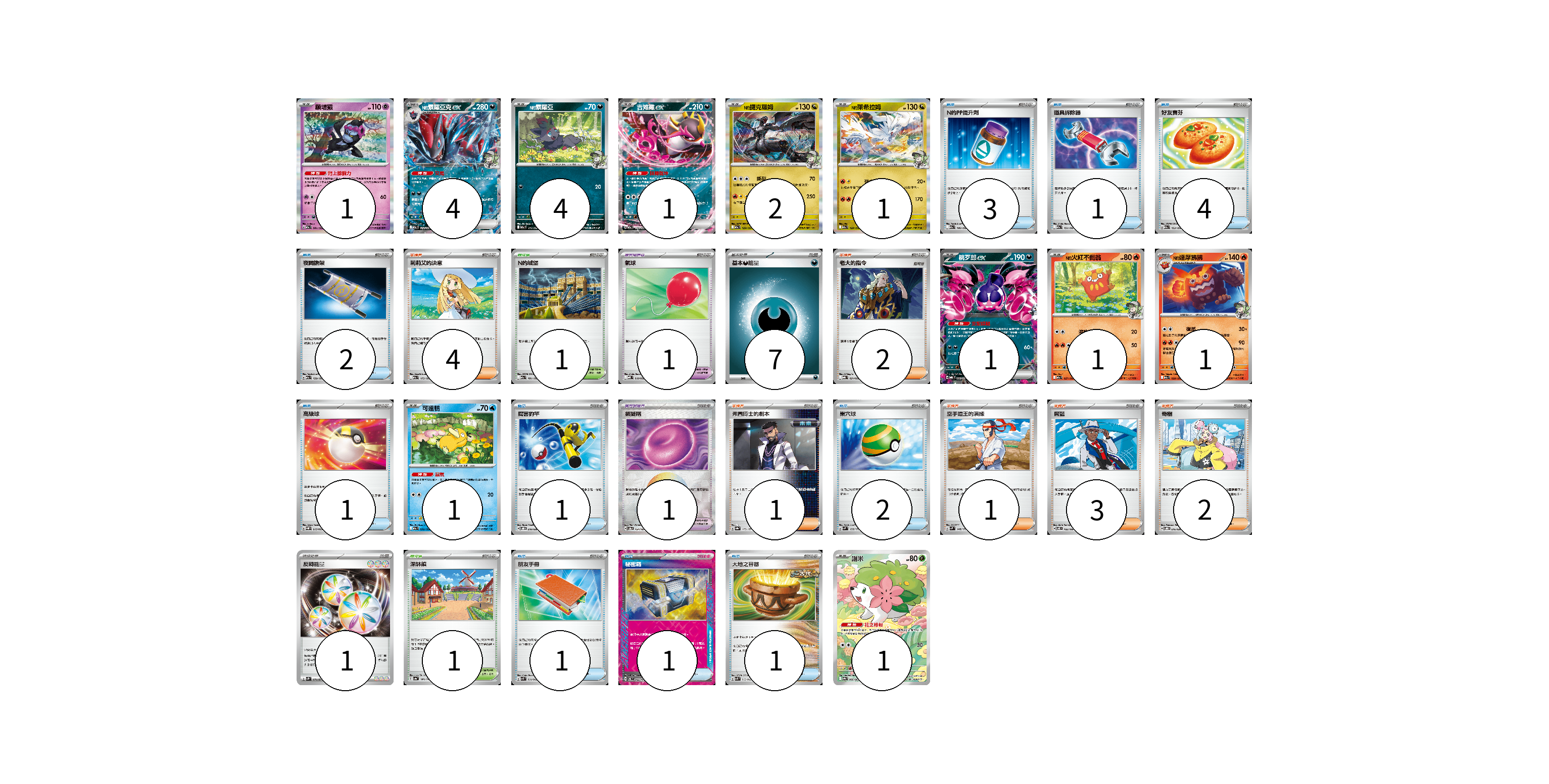 牌組構築方案 以此牌組為基礎新構築牌組 顯示卡面 顯示列表 寶可夢卡(18) 1 4 4 1 2 1 1 1 1 1 1 寶可夢道具(1) 1 物品卡(18) 3 1 4 2 1 1 1 2 1 1 1 支援者卡(13) 4 2 1 1 3 2 競技場卡(2) 1 1 能量卡(8) 7 1 寶可夢卡(18) 卡牌名稱 張數 卡牌名稱 張數 願增猿 M2a 081/193 01 N的索羅亞克ex M2a 112/193 04 N的索羅亞 M2a 111/193 04 吉雉雞ex M2a 114/193 01 N的捷克羅姆 M2a 129/193 02 N的萊希拉姆 M2a 128/193 01 桃歹郎ex MBG 009/022 01 N的火紅不倒翁 M2a 027/193 01 N的達摩狒狒 M2a 028/193 01 可達鴨 M2a 032/193 01 謝米 SV9a 066/063 01 寶可夢道具(1) 卡牌名稱 張數 卡牌名稱 張數 鎖鏈糬 SV8a 154/187 01 物品卡(18) 卡牌名稱 張數 卡牌名稱 張數 N的PP提升劑 M2a 146/193 03 道具拆除器 M2a 151/193 01 好友寶芬 M2a 153/193 04 夜間擔架 M2a 159/193 02 氣球 MBD 018/022 01 高級球 SVQP 015/023 01 厲害釣竿 SVOD 010/020 01 巢穴球 SVM 133/175 02 朋友手冊 SVK 014/042 01 秘密箱 SV6 092/101 01 大地之容器 SVK 012/042 01 支援者卡(13) 卡牌名稱 張數 卡牌名稱 張數 莉莉艾的決意 M2a 175/193 04 老大的指令 MBG 021/022 02 弗圖博士的劇本 SV8a 175/187 01 空手道王的演練 SVM 148/175 01 席藍 SV8 102/106 03 奇樹 SVOD 016/020 02 競技場卡(2) 卡牌名稱 張數 卡牌名稱 張數 N的城堡 M2a 181/193 01 深缽鎮 SV4a 185/190 01 能量卡(8) 卡牌名稱 張數 卡牌名稱 張數 基本【惡】能量 MBG DAR 07 反轉能量 SV2P 071/071 01 以此牌組為基礎新構築牌組 牌組編碼 AzQDtS-qOdSvQ-SYfuYF copy 列印牌組單 牌組編碼已複製 分享至SNS