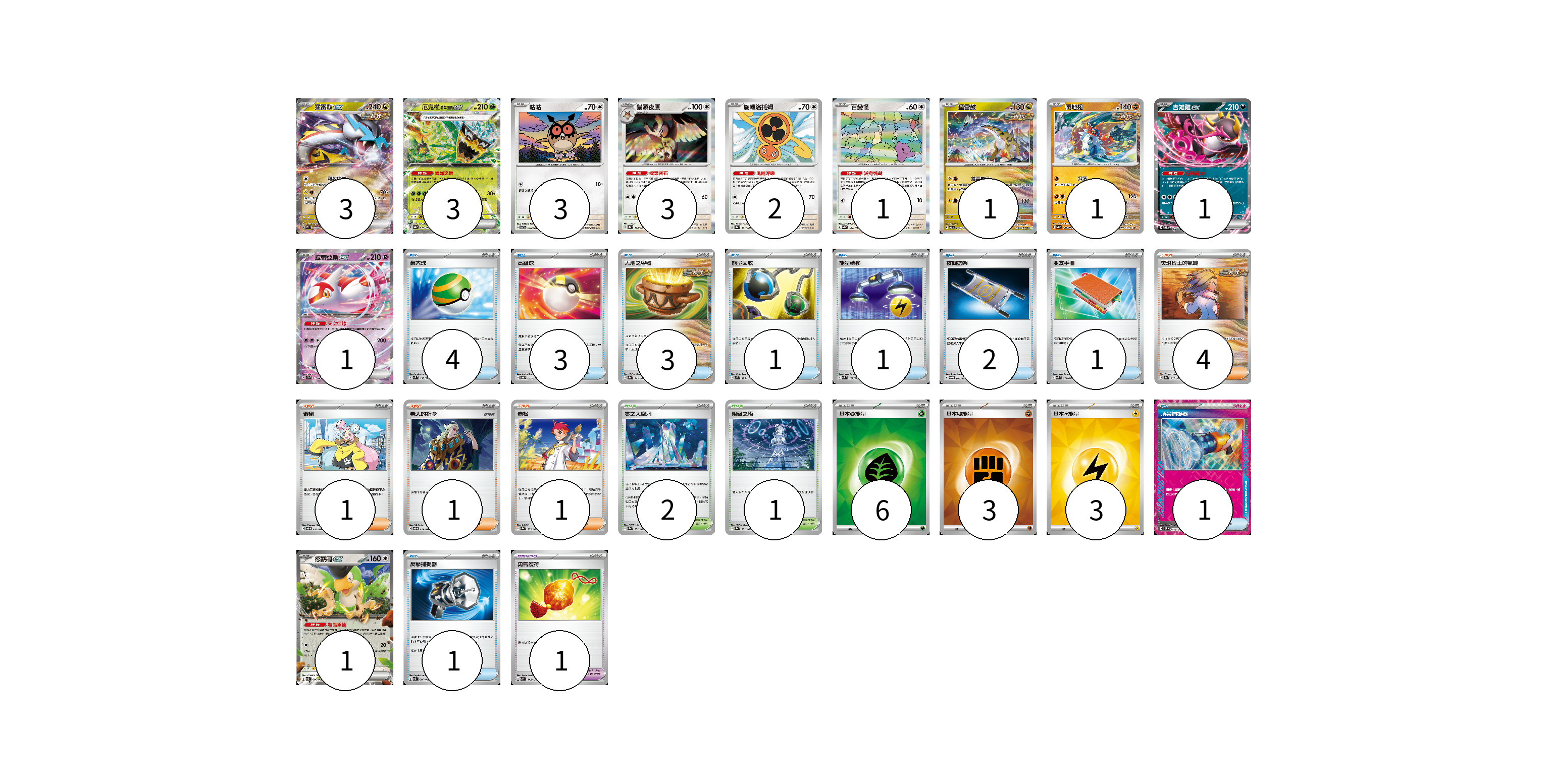 牌組構築方案 以此牌組為基礎新構築牌組 顯示卡面 顯示列表 寶可夢卡(20) 3 3 3 3 2 1 1 1 1 1 1 寶可夢道具(1) 1 物品卡(17) 4 3 3 1 1 2 1 1 1 支援者卡(7) 4 1 1 1 競技場卡(3) 2 1 能量卡(12) 6 3 3 寶可夢卡(20) 卡牌名稱 張數 卡牌名稱 張數 猛雷鼓ex SV5K 053/071 03 厄鬼椪 碧草面具ex SV8a 020/187 03 咕咕 SV7 076/102 03 貓頭夜鷹 SV8a 128/187 03 旋轉洛托姆 SV8a 131/187 02 百變怪 SV4a 144/190 01 猛雷鼓 SV7 075/102 01 爬地翅 SV4K 041/066 01 吉雉雞ex SVOD 004/020 01 拉帝亞斯ex SV7a 019/064 01 怒鸚哥ex SVK 006/042 01 寶可夢道具(1) 卡牌名稱 張數 卡牌名稱 張數 勇氣護符 SVM 142/175 01 物品卡(17) 卡牌名稱 張數 卡牌名稱 張數 巢穴球 SVM 133/175 04 高級球 SVOD 012/020 03 大地之容器 SV8a 143/187 03 能量回收 SVM 125/175 01 能量轉移 SVM 127/175 01 夜間擔架 SVOM 016/021 02 朋友手冊 SVK 014/042 01 頂尖捕捉器 SV5M 062/071 01 反擊捕捉器 SVK 009/042 01 支援者卡(7) 卡牌名稱 張數 卡牌名稱 張數 奧琳博士的氣魄 SV8a 167/187 04 奇樹 SVOD 016/020 01 老大的指令 SVOD 019/020 01 赤松 SV8a 163/187 01 競技場卡(3) 卡牌名稱 張數 卡牌名稱 張數 零之大空洞 SV8a 182/187 02 阻礙之塔 SV8a 181/187 01 能量卡(12) 卡牌名稱 張數 卡牌名稱 張數 基本【草】能量 SVK GRA 06 基本【鬥】能量 SVK FIG 03 基本【雷】能量 SVK LIG 03 以此牌組為基礎新構築牌組 牌組編碼 BBZXAh-Vrmwse-LmpilC copy 列印牌組單 牌組編碼已複製 分享至SNS
