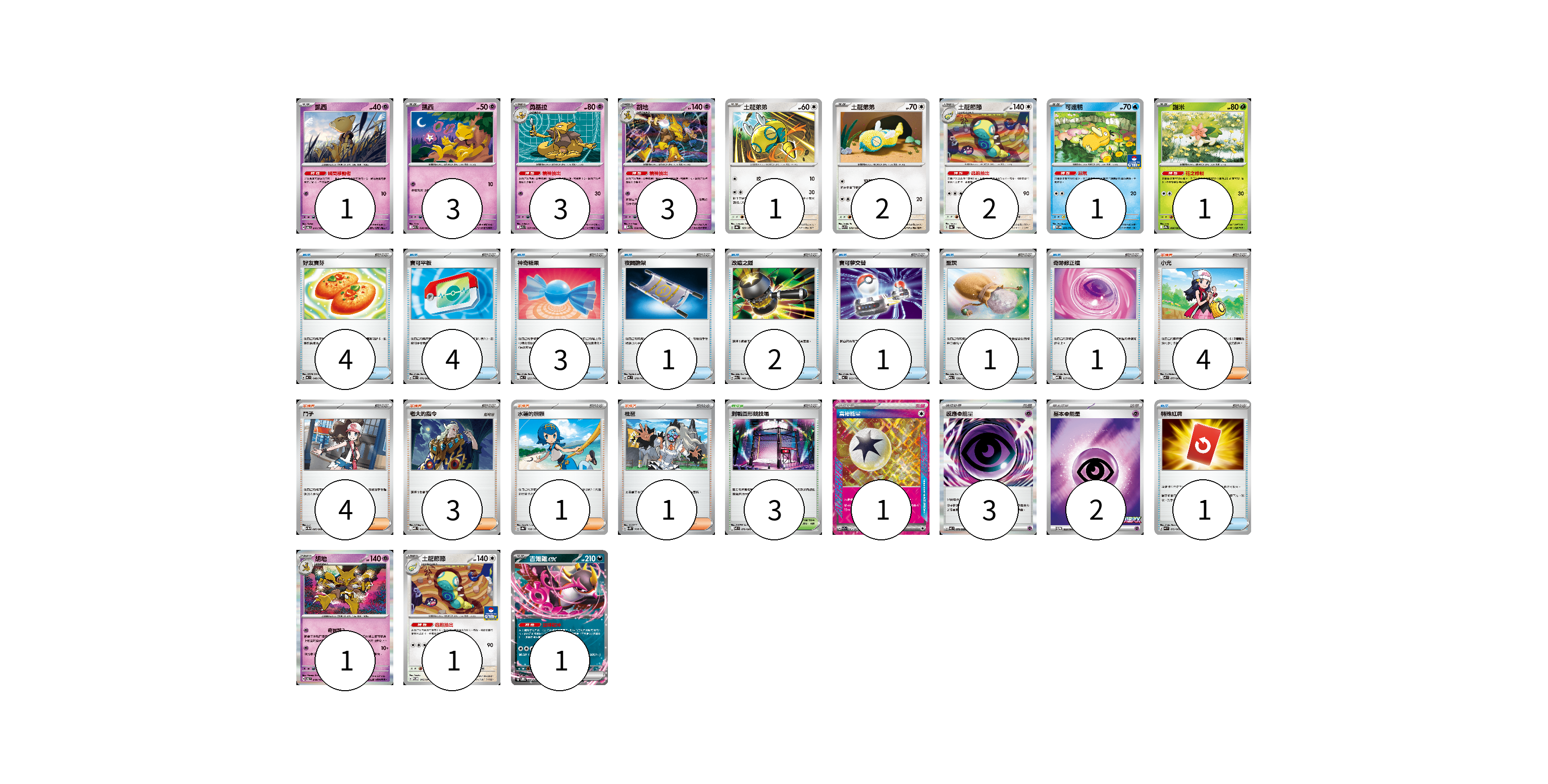 牌組構築方案 以此牌組為基礎新構築牌組 顯示卡面 顯示列表 寶可夢卡(20) 1 3 3 3 1 2 2 1 1 1 1 1 物品卡(18) 4 4 3 1 2 1 1 1 1 支援者卡(13) 4 4 3 1 1 競技場卡(3) 3 能量卡(6) 1 3 2 寶可夢卡(20) 卡牌名稱 張數 卡牌名稱 張數 凱西 SV6 047/101 01 凱西 M1S 036/063 03 勇基拉 M1S 037/063 03 胡地 M1S 038/063 03 土龍弟弟 SV8a 129/187 01 土龍弟弟 SV9 078/100 02 土龍節節 SV8a 130/187 02 可達鴨 SV-P 220/SV-P 01 謝米 SV9a 006/063 01 胡地 SV6 049/101 01 土龍節節 M-P 045/M-P 01 吉雉雞ex SVOD 004/020 01 物品卡(18) 卡牌名稱 張數 卡牌名稱 張數 好友寶芬 MC 648/742 04 寶可平板 M3 070/080 04 神奇糖果 MC 655/742 03 夜間擔架 MC 670/742 01 改造之錘 M2a 148/193 02 寶可夢交替 MC 663/742 01 聖灰 M2a 150/193 01 奇跡修正檔 MBD 017/022 01 特殊紅牌 M4 072/083 01 支援者卡(13) 卡牌名稱 張數 卡牌名稱 張數 小光 M2 077/080 04 鬥子 SV11W 085/086 04 老大的指令 MBD 020/022 03 水蓮的照顧 SV8a 168/187 01 枇琶 SV5K 068/071 01 競技場卡(3) 卡牌名稱 張數 卡牌名稱 張數 對戰圓形競技場 M2 079/080 03 能量卡(6) 卡牌名稱 張數 卡牌名稱 張數 富裕能量 SV7a 064/064 01 感應【超】能量 M3 079/080 03 基本【超】能量 M-P 033/M-P 02 以此牌組為基礎新構築牌組 牌組編碼 BCEVxu-dbghap-Wtpvdt copy 列印牌組單 牌組編碼已複製 分享至SNS