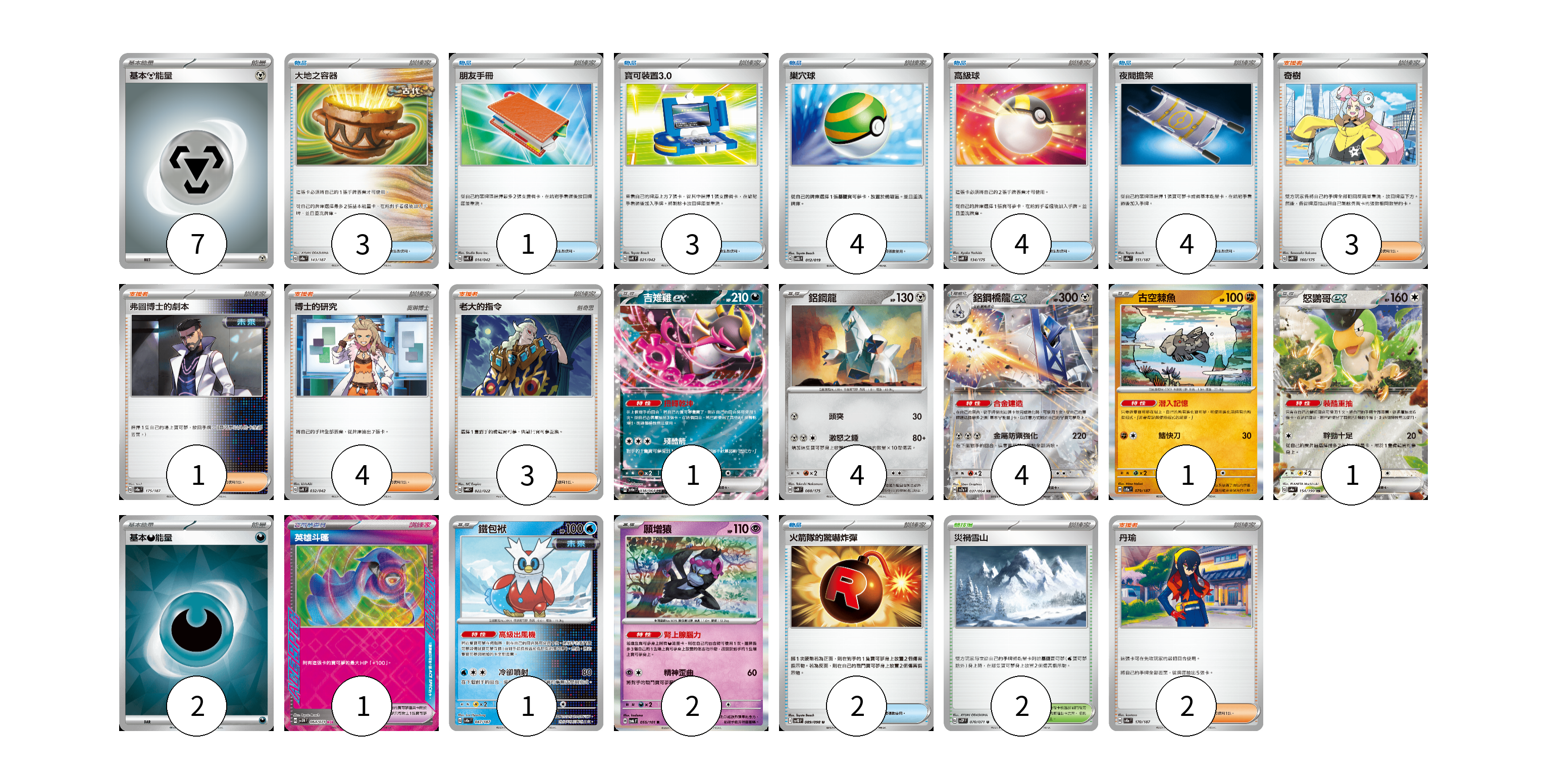 牌組構築方案 以此牌組為基礎新構築牌組 顯示卡面 顯示列表 寶可夢卡(14) 1 4 4 1 1 1 2 寶可夢道具(1) 1 物品卡(21) 3 1 3 4 4 4 2 支援者卡(13) 3 1 4 3 2 競技場卡(2) 2 能量卡(9) 7 2 寶可夢卡(14) 卡牌名稱 張數 卡牌名稱 張數 吉雉雞ex SV6a 038/064 01 鋁鋼龍 SVM 088/175 04 鋁鋼橋龍ex SV7a 037/064 04 古空棘魚 SV8a 079/187 01 怒鸚哥ex SV4a 154/190 01 鐵包袱 SV8a 047/187 01 願增猿 SV6 055/101 02 寶可夢道具(1) 卡牌名稱 張數 卡牌名稱 張數 英雄斗篷 SV5M 064/071 01 物品卡(21) 卡牌名稱 張數 卡牌名稱 張數 大地之容器 SV8a 143/187 03 朋友手冊 SVK 014/042 01 寶可裝置3.0 SVK 021/042 03 巢穴球 SVTG 012/019 04 高級球 SVM 134/175 04 夜間擔架 SV8a 151/187 04 火箭隊的驚嚇炸彈 SV10 089/098 02 支援者卡(13) 卡牌名稱 張數 卡牌名稱 張數 奇樹 SVM 160/175 03 弗圖博士的劇本 SV8a 175/187 01 博士的研究 SVK 032/042 04 老大的指令 SVHK 022/022 03 丹瑜 SV8a 170/187 02 競技場卡(2) 卡牌名稱 張數 卡牌名稱 張數 災禍雪山 SV2P 070/071 02 能量卡(9) 卡牌名稱 張數 卡牌名稱 張數 基本鋼能量 sv-p MET 07 基本【惡】能量 SVOM DAR 02 以此牌組為基礎新構築牌組 牌組編碼 BFLEeF-ZZKYRi-RSYGoe copy 列印牌組單 牌組編碼已複製 分享至SNS