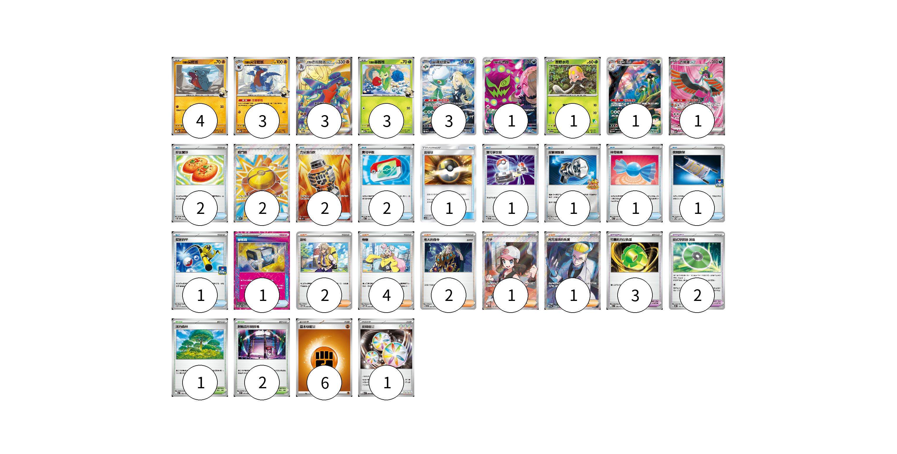 牌組構築方案 以此牌組為基礎新構築牌組 顯示卡面 顯示列表 寶可夢卡(20) 4 3 3 3 3 1 1 1 1 寶可夢道具(5) 3 2 物品卡(15) 2 2 2 2 1 1 1 1 1 1 1 支援者卡(10) 2 4 2 1 1 競技場卡(3) 1 2 能量卡(7) 6 1 寶可夢卡(20) 卡牌名稱 張數 卡牌名稱 張數 <竹蘭的>圓陸鯊 SV9a 042/063 04 <竹蘭的>尖牙陸鯊 SV9a 043/063 03 <竹蘭的>烈咬陸鯊ex SV9a 080/063 03 <竹蘭的>毒薔薇 SV9a 004/063 03 <竹蘭的>羅絲雷朵 SV9a 065/063 03 <竹蘭的>花岩怪 M2a 208/193 01 原野水母 SVI 005/066 01 陸地水母 SV4M 068/066 01 吉雉雞ex SV6a 081/064 01 寶可夢道具(5) 卡牌名稱 張數 卡牌名稱 張數 竹蘭的力量負重 MC 682/742 03 招式學習器 演進 SV8a 160/187 02 物品卡(15) 卡牌名稱 張數 卡牌名稱 張數 好友寶芬 SVOD 011/020 02 戰鬥鑼 M1L 082/063 02 力量蛋白飲 M1L 081/063 02 寶可平板 MC 662/742 02 高級球 AS6D 147/168 01 寶可夢交替 SVTL 015/021 01 反擊捕捉器 SV-P 083/SV-P 01 神奇糖果 MC 655/742 01 夜間擔架 SV-P 227/SV-P 01 厲害釣竿 SV-P 112/SV-P 01 秘密箱 SV6 092/101 01 支援者卡(10) 卡牌名稱 張數 卡牌名稱 張數 派帕 SVOD 018/020 02 奇樹 SVOD 016/020 04 老大的指令 SVTL 021/021 02 鬥子 SV11W 166/086 01 阿克羅瑪的執著 SV6a 083/064 01 競技場卡(3) 卡牌名稱 張數 卡牌名稱 張數 活力森林 M2a 182/193 01 對戰圓形競技場 M2 079/080 02 能量卡(7) 卡牌名稱 張數 卡牌名稱 張數 基本【鬥】能量 MC FIG 06 反轉能量 SVK 041/042 01 以此牌組為基礎新構築牌組 牌組編碼 BGZnuJ-SqtBIa-rvOfiF copy 列印牌組單 牌組編碼已複製 分享至SNS