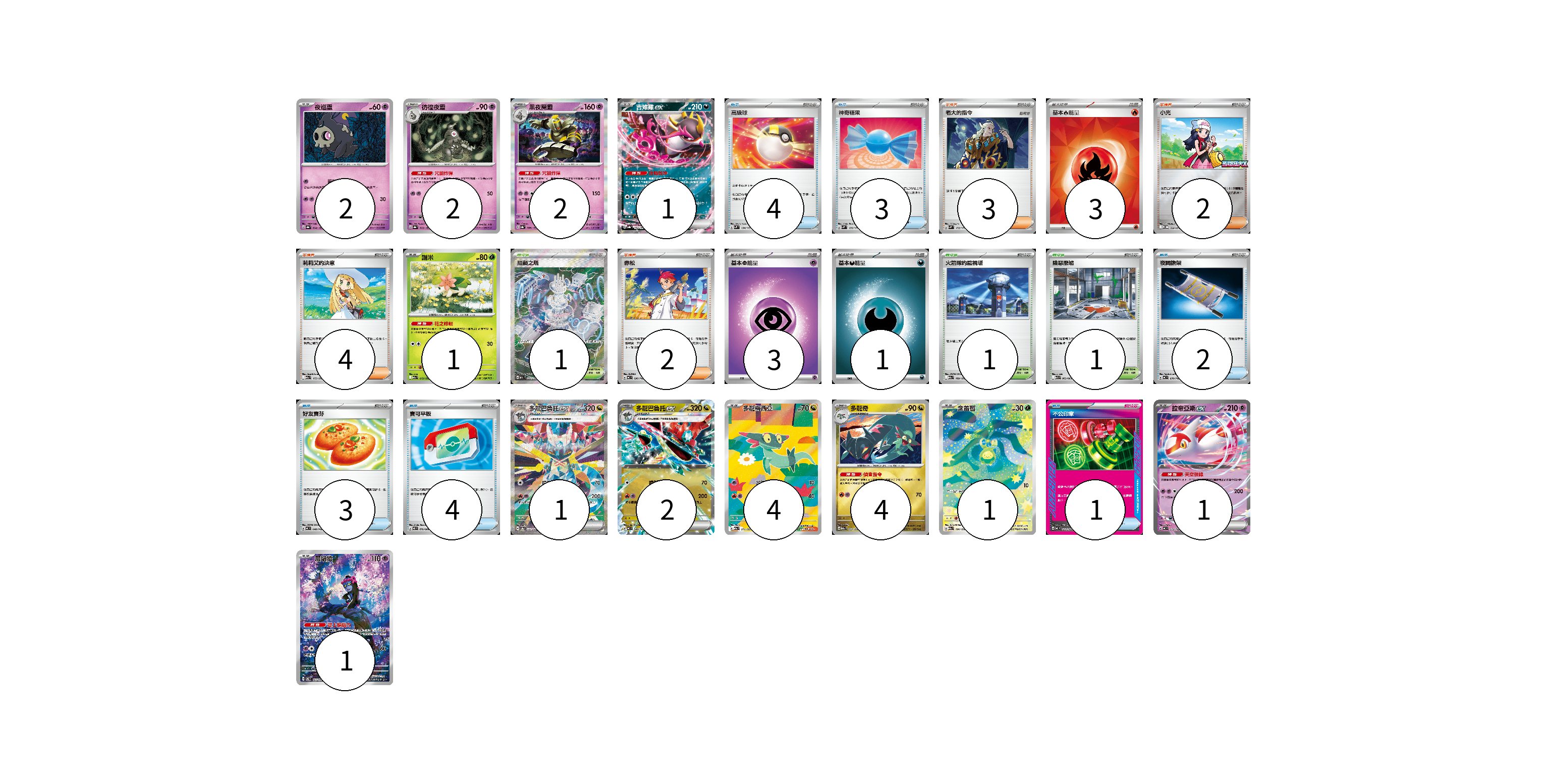 牌組構築方案 以此牌組為基礎新構築牌組 顯示卡面 顯示列表 寶可夢卡(22) 2 2 2 1 1 1 2 4 4 1 1 1 物品卡(17) 4 3 2 3 4 1 支援者卡(11) 3 2 4 2 競技場卡(3) 1 1 1 能量卡(7) 3 3 1 寶可夢卡(22) 卡牌名稱 張數 卡牌名稱 張數 夜巡靈 SV8a 064/187 02 彷徨夜靈 SV8a 065/187 02 黑夜魔靈 SV8a 066/187 02 吉雉雞ex SV8a 104/187 01 謝米 M2a 012/193 01 多龍巴魯托ex SV8a 221/187 01 多龍巴魯托ex MC 548/742 02 多龍梅西亞 M2a 211/193 04 多龍奇 M2a 133/193 04 含羞苞 M2a 196/193 01 拉帝亞斯ex MC 312/742 01 願增猿 SV6 107/101 01 物品卡(17) 卡牌名稱 張數 卡牌名稱 張數 高級球 SVM 134/175 04 神奇糖果 SVM 135/175 03 夜間擔架 MC 670/742 02 好友寶芬 MC 648/742 03 寶可平板 M3 070/080 04 不公印章 MC 633/742 01 支援者卡(11) 卡牌名稱 張數 卡牌名稱 張數 老大的指令 SVM 172/175 03 小光 M-P 028/M-P 02 莉莉艾的決意 M2a 175/193 04 赤松 MC 696/742 02 競技場卡(3) 卡牌名稱 張數 卡牌名稱 張數 阻礙之塔 M2a 222/193 01 火箭隊的監視塔 M2a 189/193 01 險惡廢墟 M1L 063/063 01 能量卡(7) 卡牌名稱 張數 卡牌名稱 張數 基本【火】能量 SVK FIR 03 基本【超】能量 MC PSY 03 基本【惡】能量 MC DAR 01 以此牌組為基礎新構築牌組 牌組編碼 BHXUWw-PAIukw-afvOOb copy 列印牌組單 牌組編碼已複製 分享至SNS