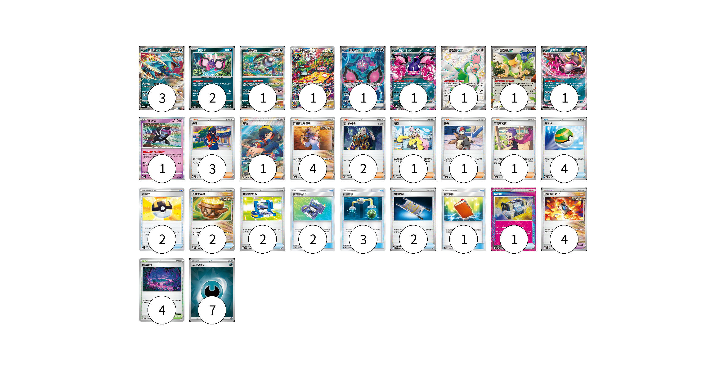 牌組構築方案 以此牌組為基礎新構築牌組 顯示卡面 顯示列表 寶可夢卡(13) 3 2 1 1 1 1 1 1 1 1 寶可夢道具(4) 4 物品卡(19) 4 2 2 2 2 3 2 1 1 支援者卡(13) 3 1 4 2 1 1 1 競技場卡(4) 4 能量卡(7) 7 寶可夢卡(13) 卡牌名稱 張數 卡牌名稱 張數 轟鳴月ex SV8a 101/187 03 桃歹郎 SV8 075/106 02 猛惡菇 SV8a 099/187 01 猛惡菇 SV4K 077/066 01 桃歹郎ex SV6a 082/064 01 桃歹郎ex SV6a 039/064 01 怒鸚哥ex SV4a 337/190 01 怒鸚哥ex SVK 006/042 01 吉雉雞ex SV8a 104/187 01 願增猿 SV8a 075/187 01 寶可夢道具(4) 卡牌名稱 張數 卡牌名稱 張數 驅勁能量 古代 SV8a 157/187 04 物品卡(19) 卡牌名稱 張數 卡牌名稱 張數 巢穴球 SVM 133/175 04 高級球 S12a 138/172 02 大地之容器 SVHK 011/022 02 寶可裝置3.0 SVK 021/042 02 寶可齒輪3.0 AS6D 150/168 02 能量轉移 AS6D 142/168 03 夜間擔架 SVOM 016/021 02 朋友手冊 AC2D 145/176 01 秘密箱 SV6 092/101 01 支援者卡(13) 卡牌名稱 張數 卡牌名稱 張數 丹瑜 SV8a 170/187 03 丹瑜 SV6 123/101 01 奧琳博士的氣魄 SV8a 167/187 04 老大的指令 SVOD 019/020 02 奇樹 SVOD 016/020 01 牡丹 SV4a 182/190 01 阿杏的秘招 SV8a 166/187 01 競技場卡(4) 卡牌名稱 張數 卡牌名稱 張數 危險密林 SV5K 070/071 04 能量卡(7) 卡牌名稱 張數 卡牌名稱 張數 基本【惡】能量 SVOM DAR 07 以此牌組為基礎新構築牌組 牌組編碼 BHvToE-slUypQ-KxfzDb copy 列印牌組單 牌組編碼已複製 分享至SNS