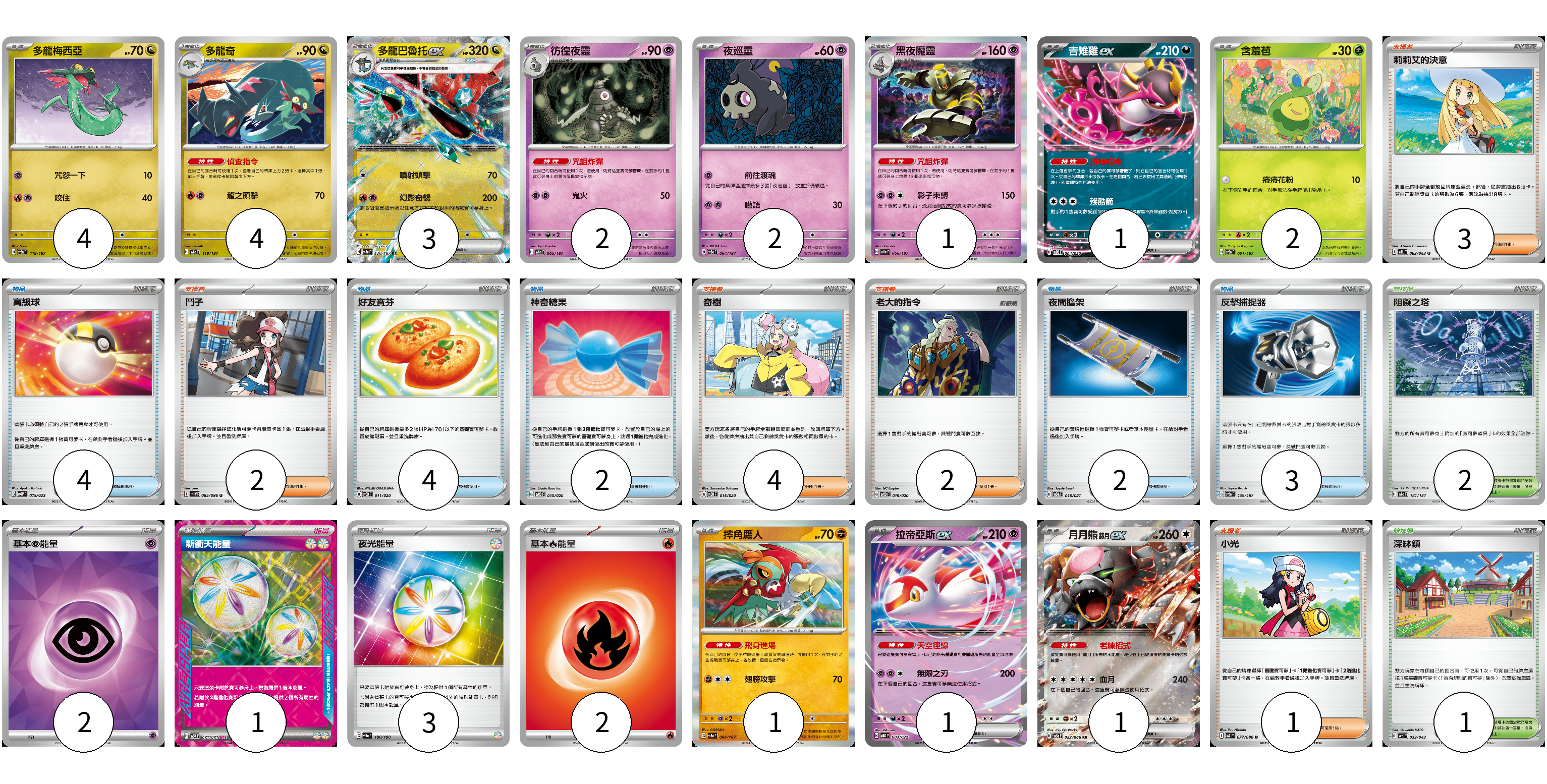 牌組構築方案 以此牌組為基礎新構築牌組 顯示卡面 顯示列表 寶可夢卡(22) 4 4 3 2 2 1 1 2 1 1 1 物品卡(15) 4 4 2 2 3 支援者卡(12) 3 2 4 2 1 競技場卡(3) 2 1 能量卡(8) 2 1 3 2 寶可夢卡(22) 卡牌名稱 張數 卡牌名稱 張數 多龍梅西亞 SV8a 118/187 04 多龍奇 SV8a 119/187 04 多龍巴魯托ex SV8a 120/187 03 彷徨夜靈 SV8a 065/187 02 夜巡靈 SV8a 064/187 02 黑夜魔靈 SV8a 066/187 01 吉雉雞ex SVOD 004/020 01 含羞苞 SV8a 001/187 02 摔角鷹人 SV8a 084/187 01 拉帝亞斯ex MBD 003/022 01 月月熊 赫月 ex SV5a 052/066 01 物品卡(15) 卡牌名稱 張數 卡牌名稱 張數 高級球 SVQP 015/023 04 好友寶芬 SVOD 011/020 04 神奇糖果 SVOD 013/020 02 夜間擔架 SVOM 016/021 02 反擊捕捉器 SV8a 139/187 03 支援者卡(12) 卡牌名稱 張數 卡牌名稱 張數 莉莉艾的決意 M1L 062/063 03 鬥子 SV11W 085/086 02 奇樹 SVOD 016/020 04 老大的指令 SVOD 019/020 02 小光 M2 077/080 01 競技場卡(3) 卡牌名稱 張數 卡牌名稱 張數 阻礙之塔 SV8a 181/187 02 深缽鎮 SVK 039/042 01 能量卡(8) 卡牌名稱 張數 卡牌名稱 張數 基本【超】能量 SVOD PSY 02 新衝天能量 SV5K 071/071 01 夜光能量 SV4a 190/190 03 基本火能量 sv-p FIR 02 以此牌組為基礎新構築牌組 牌組編碼 BIEOpN-PGtIlr-LsIVSM copy 列印牌組單 牌組編碼已複製 分享至SNS