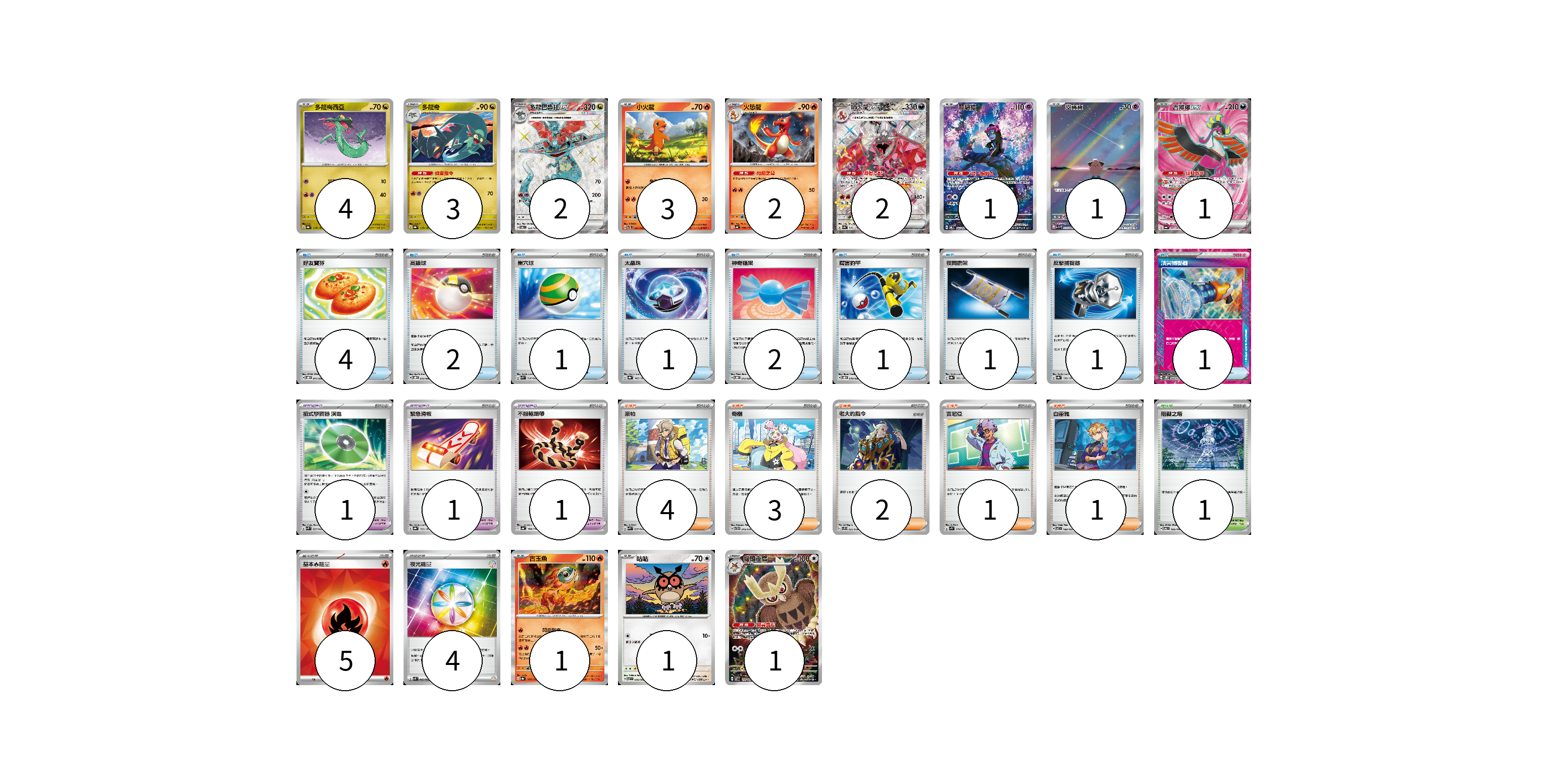牌組構築方案 以此牌組為基礎新構築牌組 顯示卡面 顯示列表 寶可夢卡(22) 4 3 2 3 2 2 1 1 1 1 1 1 寶可夢道具(3) 1 1 1 物品卡(14) 4 2 1 1 2 1 1 1 1 支援者卡(11) 4 3 2 1 1 競技場卡(1) 1 能量卡(9) 5 4 寶可夢卡(22) 卡牌名稱 張數 卡牌名稱 張數 多龍梅西亞 SV8a 118/187 04 多龍奇 SV8a 119/187 03 多龍巴魯托ex SV6 120/101 02 小火龍 SVTL 001/021 03 火恐龍 SV4a 026/190 02 噴火龍ex SV4a 331/190 02 願增猿 SV6 107/101 01 皮寶寶 SV3 113/108 01 吉雉雞ex SV6a 081/064 01 古玉魚 SV8a 025/187 01 咕咕 SV7 076/102 01 貓頭夜鷹 SV7 114/102 01 寶可夢道具(3) 卡牌名稱 張數 卡牌名稱 張數 招式學習器 演進 SVK 025/042 01 緊急滑板 SV8a 153/187 01 不服輸頭帶 SV4a 168/190 01 物品卡(14) 卡牌名稱 張數 卡牌名稱 張數 好友寶芬 SVOD 011/020 04 高級球 SVOD 012/020 02 巢穴球 SVK 016/042 01 太晶珠 SV8a 145/187 01 神奇糖果 SVOD 013/020 02 厲害釣竿 SVOD 010/020 01 夜間擔架 SV8a 151/187 01 反擊捕捉器 SV8a 139/187 01 頂尖捕捉器 SV5M 062/071 01 支援者卡(11) 卡牌名稱 張數 卡牌名稱 張數 派帕 SVK 035/042 04 奇樹 SVTH 015/018 03 老大的指令 SVF 032/038 02 吉尼亞 SV1S 074/078 01 白蕾雅 SV7 100/102 01 競技場卡(1) 卡牌名稱 張數 卡牌名稱 張數 阻礙之塔 SV6 100/101 01 能量卡(9) 卡牌名稱 張數 卡牌名稱 張數 基本【火】能量 SVK FIR 05 夜光能量 SVK 042/042 04 以此牌組為基礎新構築牌組 牌組編碼 BJCmdj-mdUgYO-bSjRrm copy 列印牌組單 牌組編碼已複製 分享至SNS